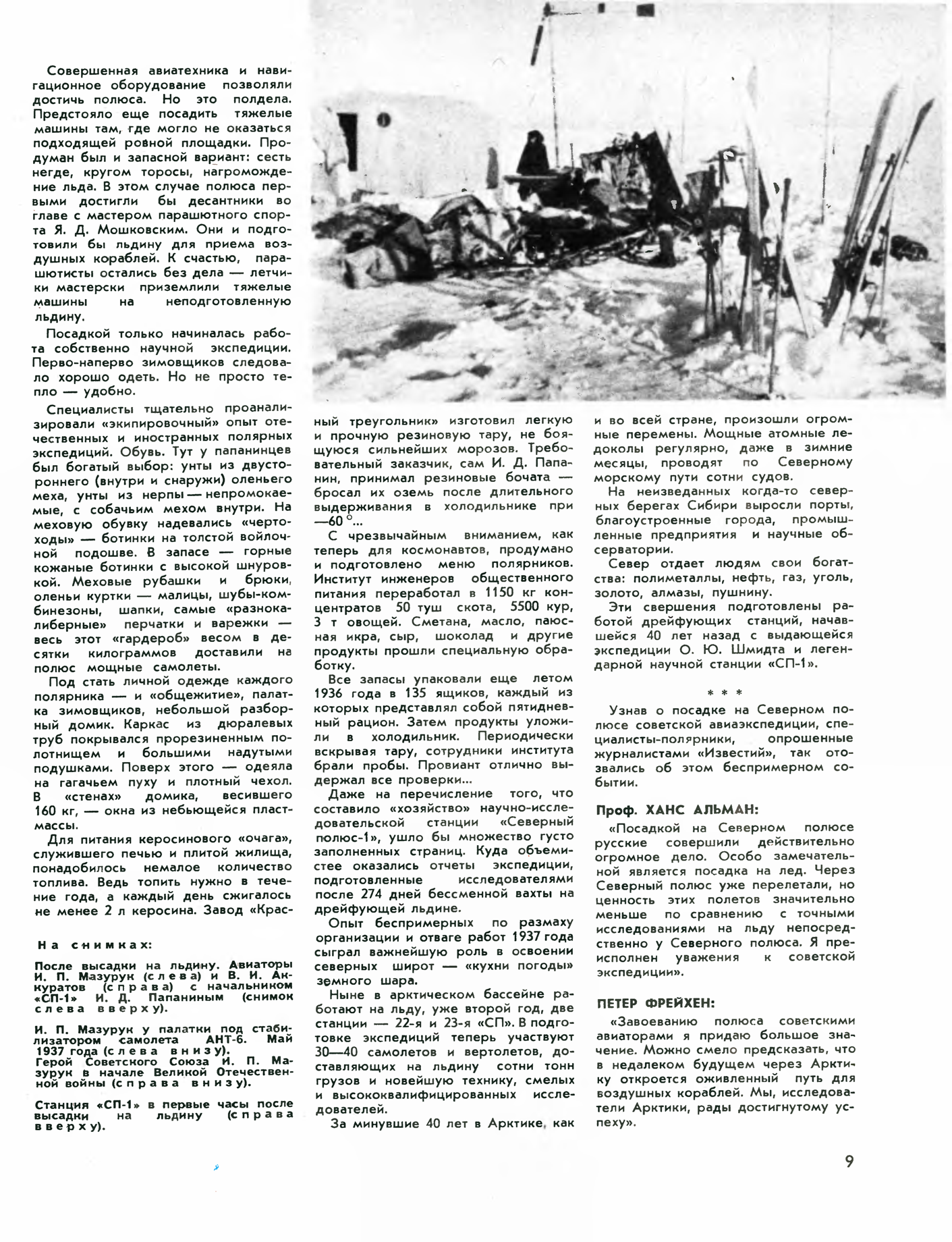 Об этом историческом событии, состоявшемся 40 лет назад, в канун 20-летнего юбилея Великои Октябрьской социалистической революции, мы попросили рассказать участника авиарейда на полюс, командира одного из самолетов Героя Советского Союза, генерал-майора авиации Илью Павловича Мазурука. После первой посадки «а лед Северного полюса прославленный летчик 254 раза водил самолеты к дрейфующим станциям «СП».