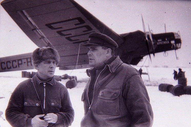 Встреча полярных летчиков И.П.Мазурука и Ф.Б.Фариха, участвовавших в высадке первой дрейфующей научной станции "Северный полюс-1". Самолет "Авиа Арктика".