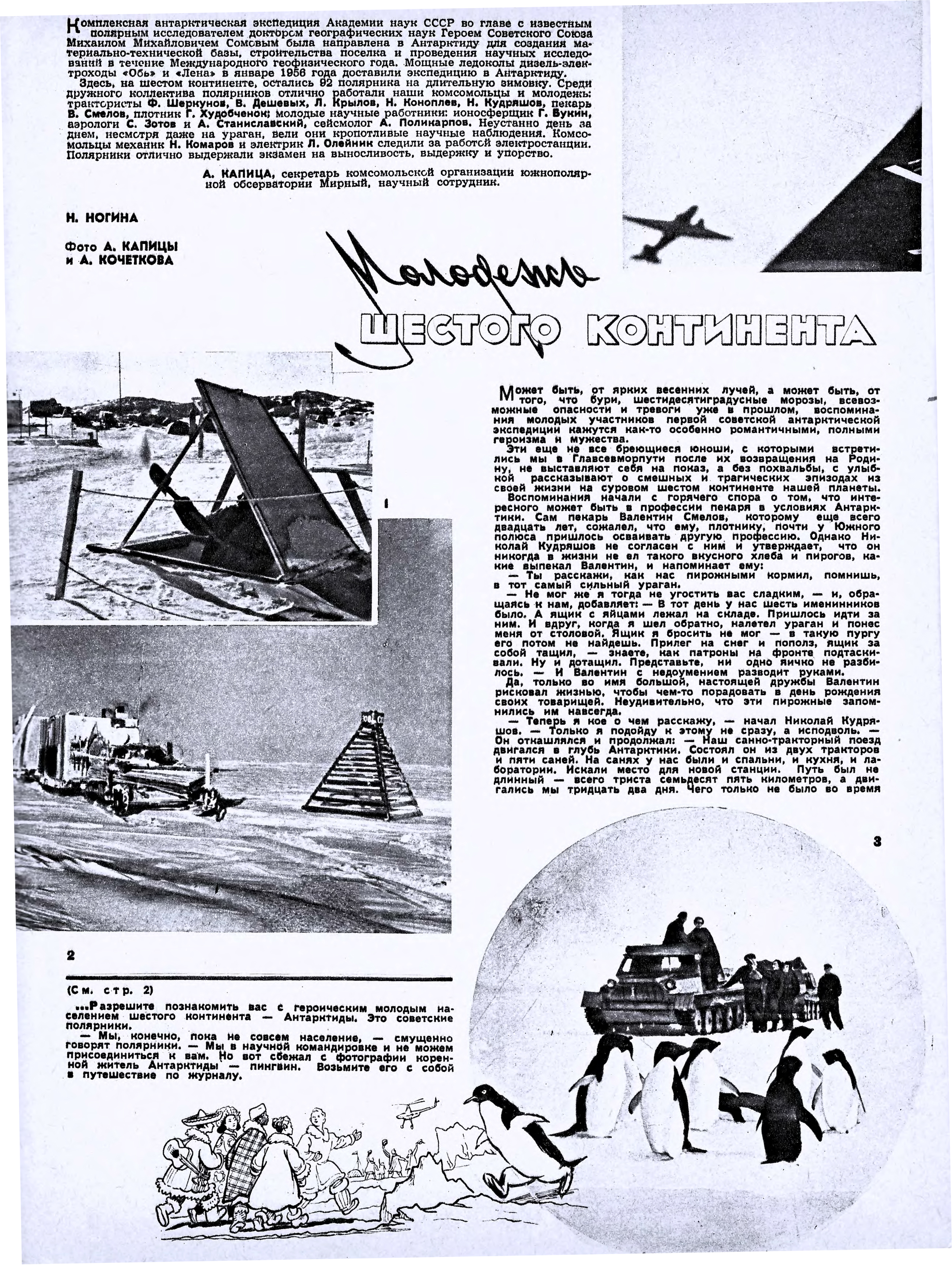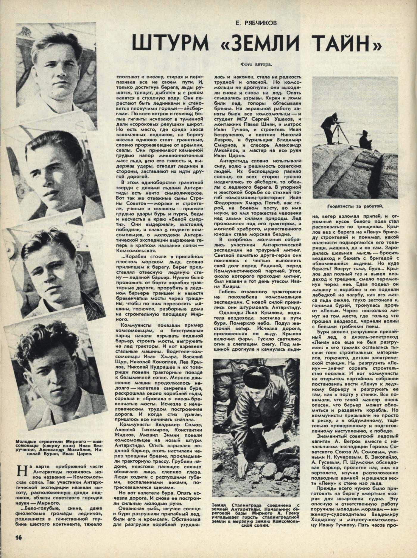 Здесь, на шестом континенте, остались 92 полярника на длительную зимовку. Среди дружного коллектива полярников отлично работали наши комсомольцы и молодежь: трактористы Ф. Шеркунов, В. Дешевых, Л. Крылов, Н. Коноплев, Н. Кудряшов, пекарь В. Смелов, плотник Г. Худобченок; молодые научные работники: ионосферщик Г. Букин, аэрологи С. Зотов и А. Станиславский, сейсмолог А. Поликарпов. Неустанно день за днем, несмотря даже на ураган, Вели они кропотливые научные наблюдения. Комсомольцы механик Н. Комаров и электрик Л. Олейник следили за работой электростанции. Полярники отлично выдержали экзамен на выносливость, выдержку и упорство.