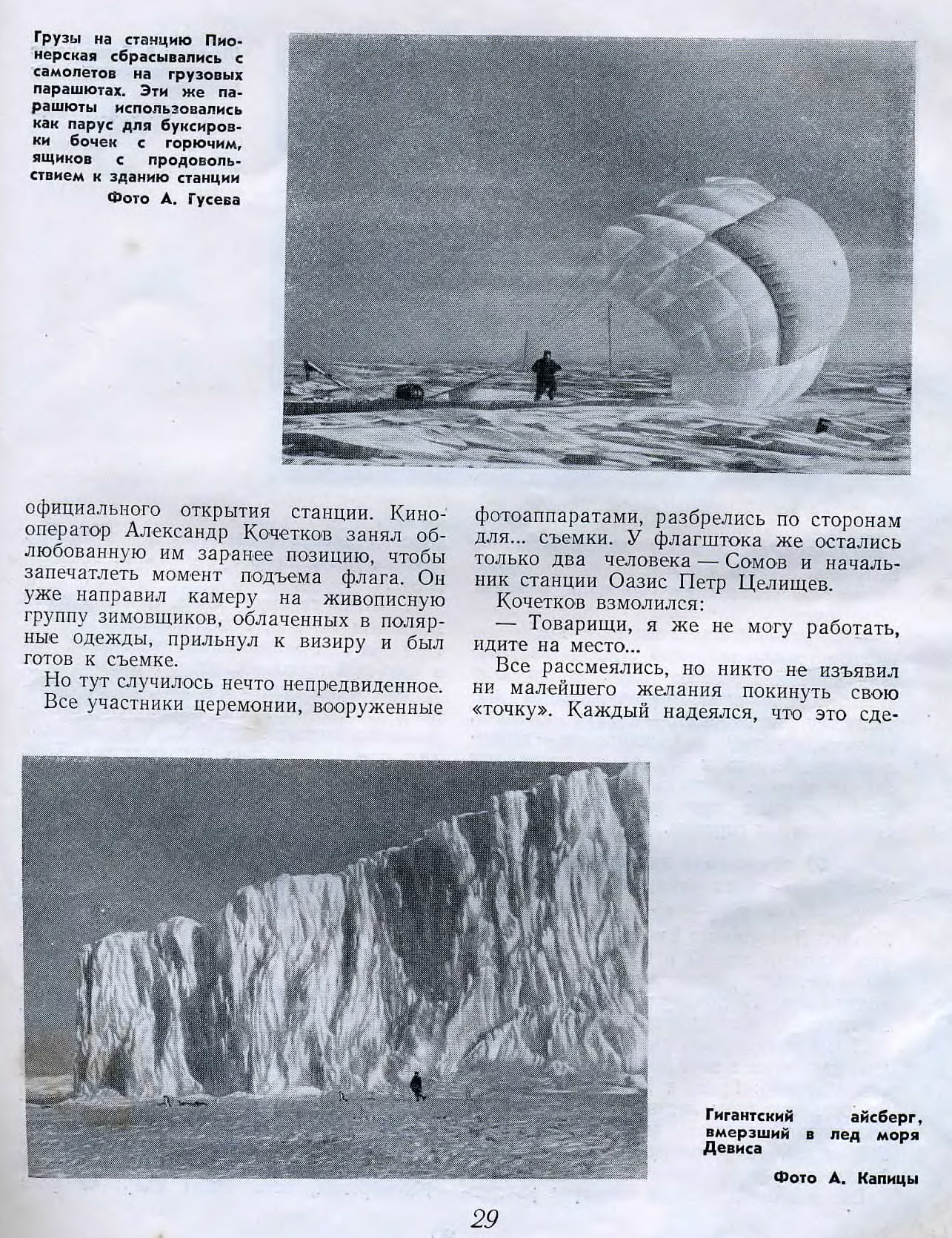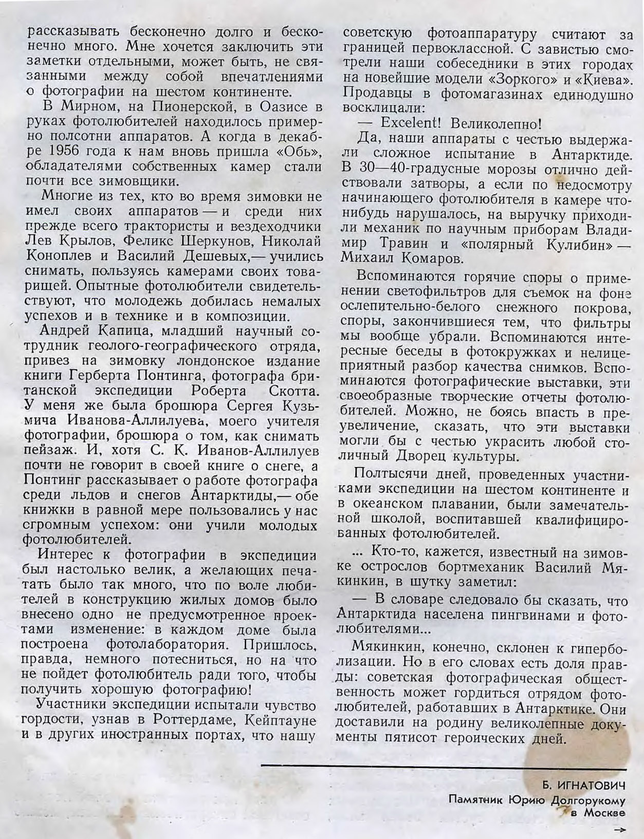 Мякинкин, конечно, склонен к гиперболизации. Но в его словах есть доля правды: советская фотографическая общественность может гордиться отрядом фотолюбителей, работавших в Антарктике. Они доставили на родину великолепные документы пятисот героических дней.