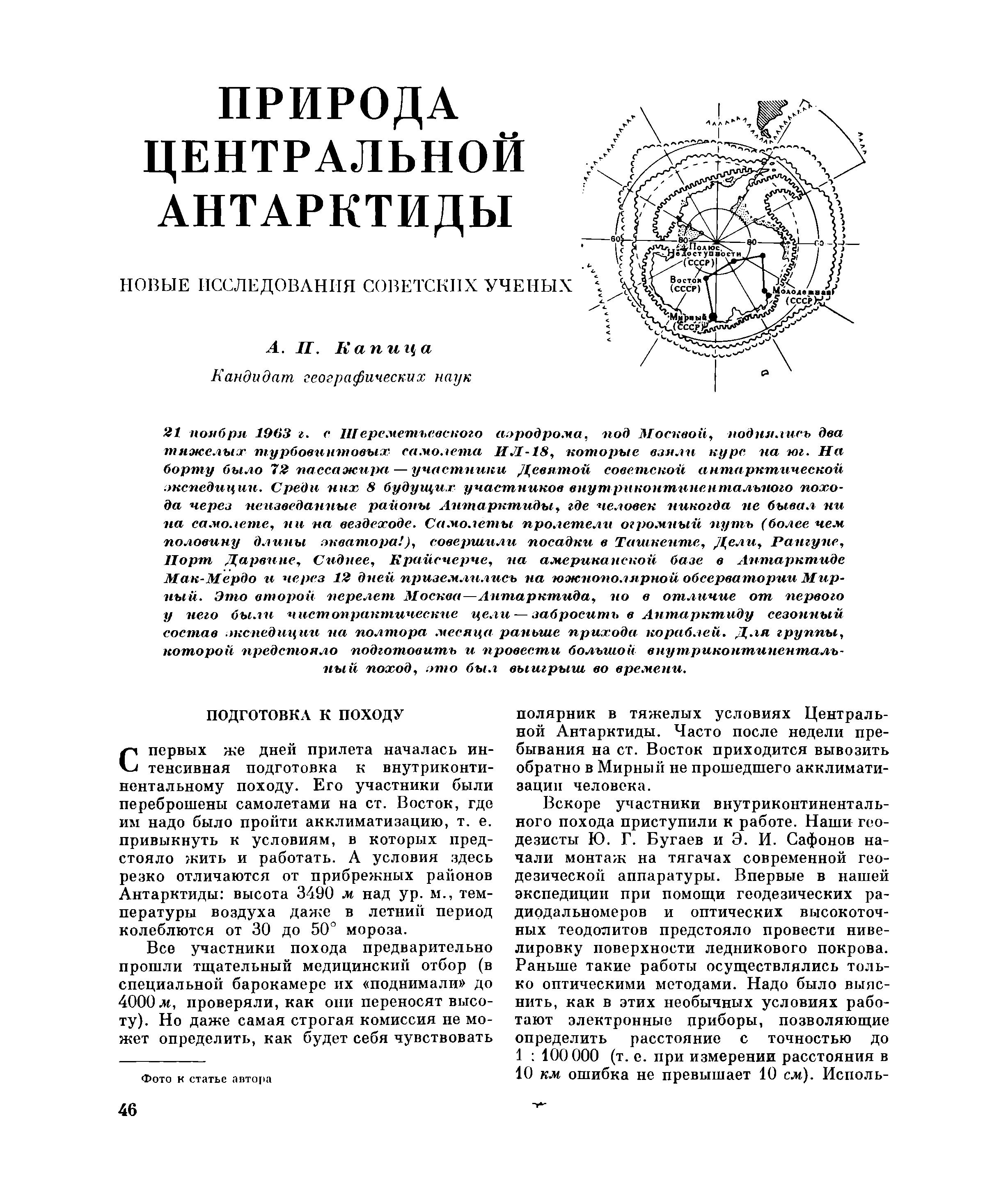 Кандидат географических наук21 ноябри 1963 г. с Шереметьевского аэродрома, под Москвой, поднялись два тяжелых турбовинтовых самолета ИЛ-18, которые взяли курс, на юг. На борту было 72 пассажира — участники Девятой советской антарктической экспедиции. Среди них 8 будущих участников внутриконтинентального похода через неизведанные районы Антарктиды, где человек никогда не бывал ни на самолете, ни на вездеходе. Самолеты пролетели огромный путь (более чем половину длины экватора!), совершили посадки в Ташкенте, Дели, Рангуне, Порт Дарвине, Сиднее, Крайсчерче, на американской базе в Антарктиде Мак-Мёрдо и через 12 дней приземлились на южнополярной обсерватории Мирный. Это второй перелет Москва — Антарктида, но в отличие от первого у него были чисто практические цели — забросить в Антарктиду сезонный состав экспедиции на полтора месяца раньше прихода кораблей. Для группы, которой предстояло подготовить и провести большой внутриконтинентальный поход, это был выигрыш во времени.