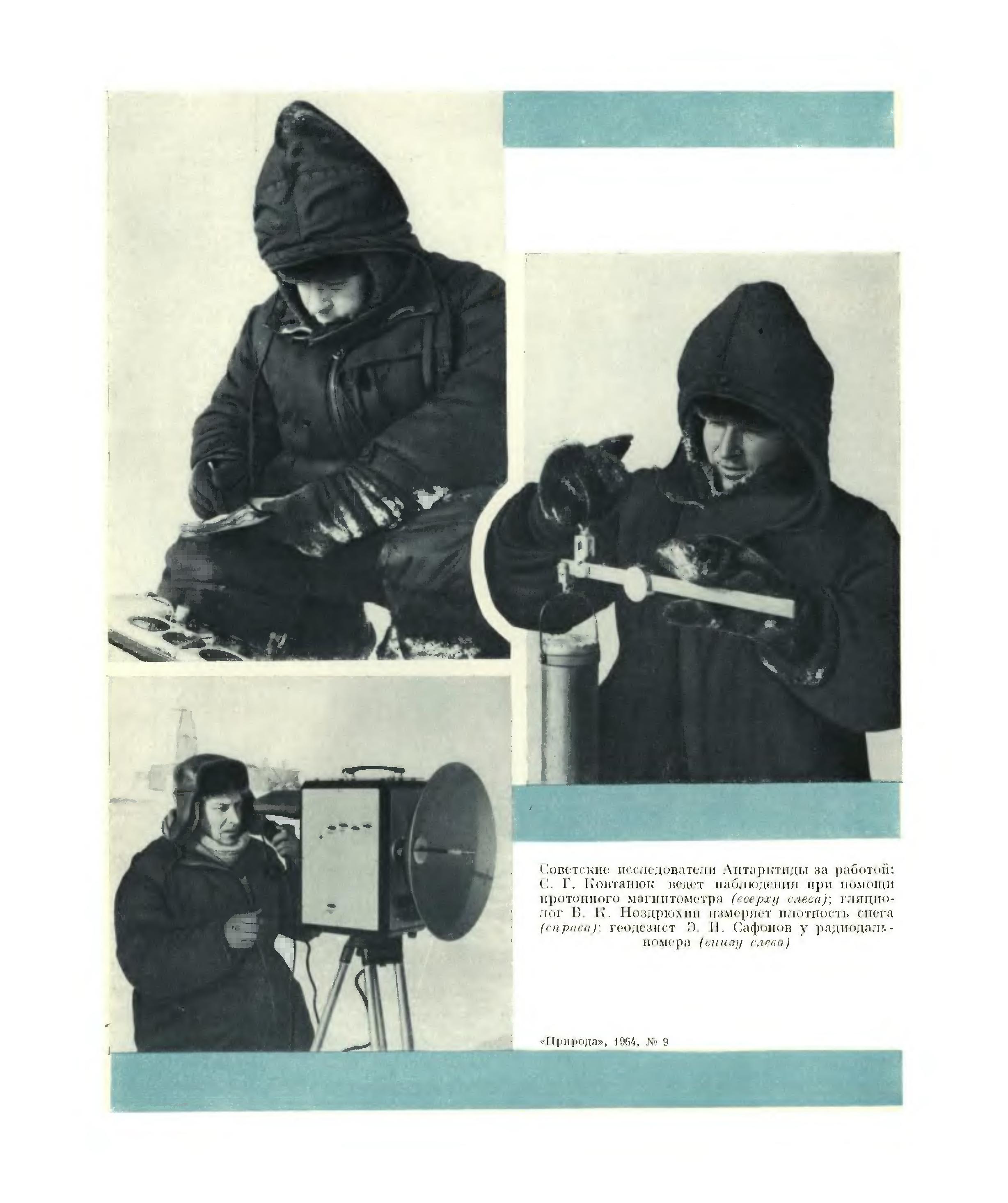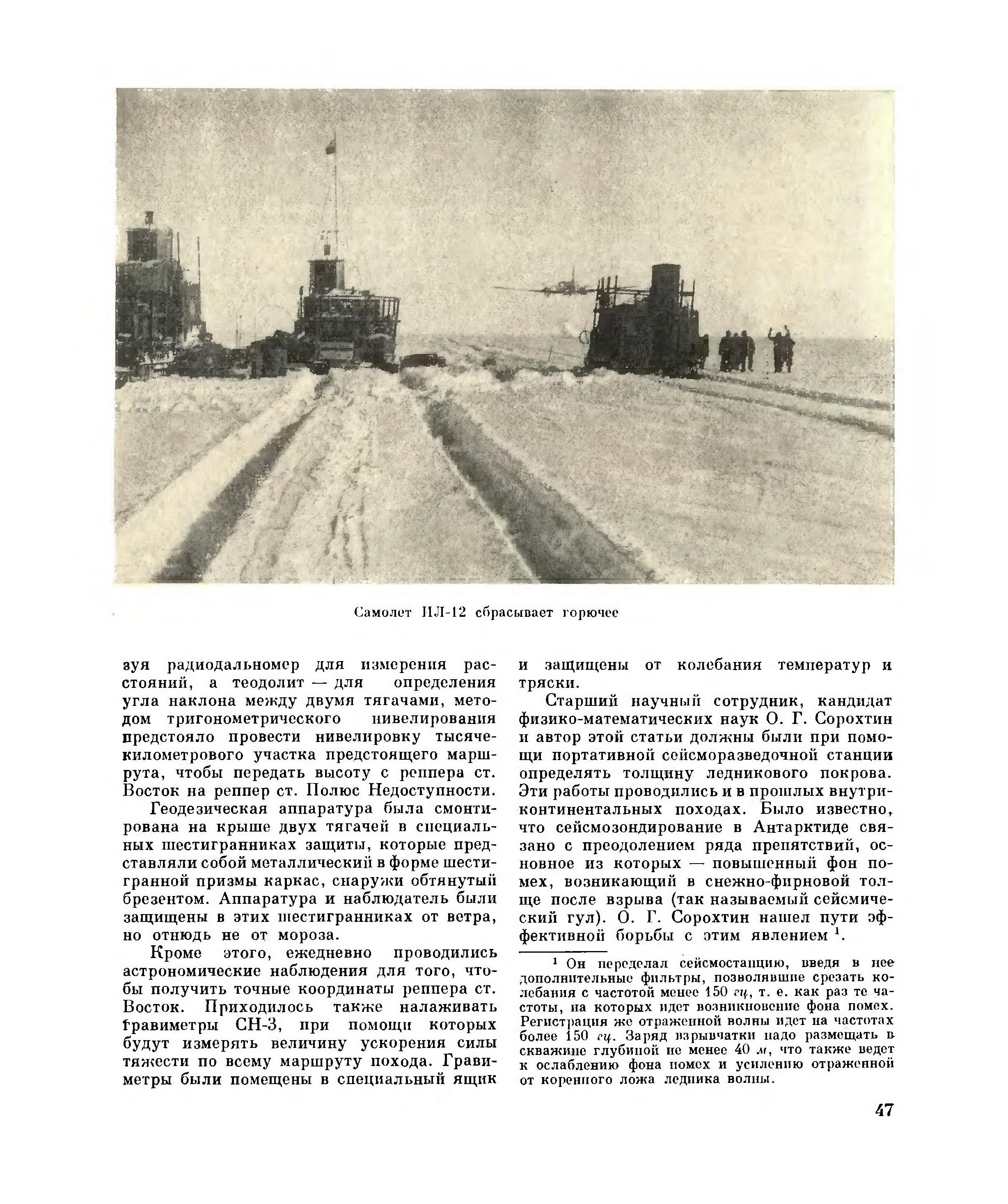Старший научный сотрудник, кандидат физико-математических наук О. Г. Сорохтин и автор этой статьи должны были при помощи портативной сейсморазведочной станции определять толщину ледникового покрова. Эти работы проводились и в прошлых внутри- континентальных походах. Было известно, что сейсмозондирование в Антарктиде связано с преодолением ряда препятствий, основное из которых — повышенный фон помех, возникающий в снежно-фирновой толще после взрыва (так называемый сейсмический гул). О. Г. Сорохтин нашел пути эффективной борьбы с этим явлением {1}.