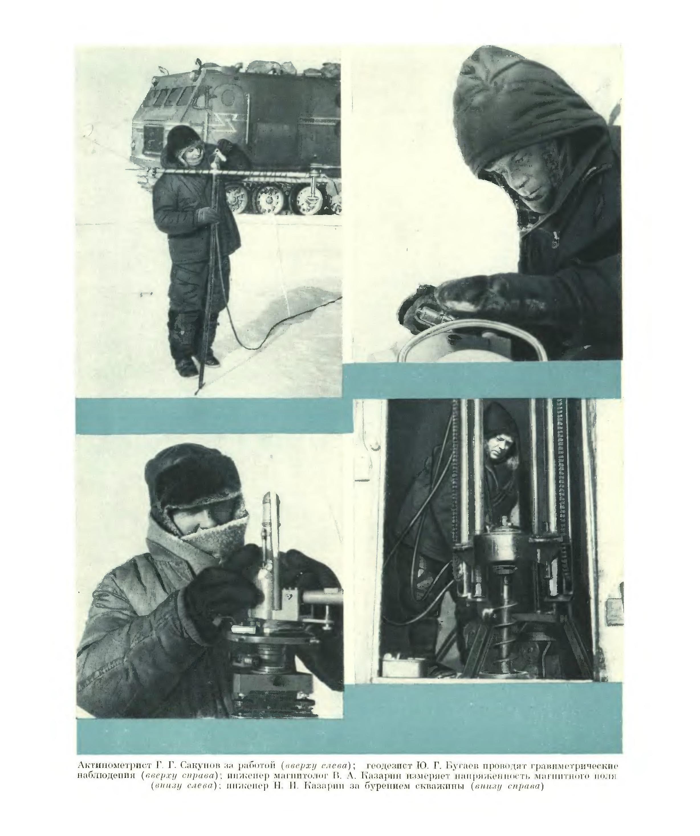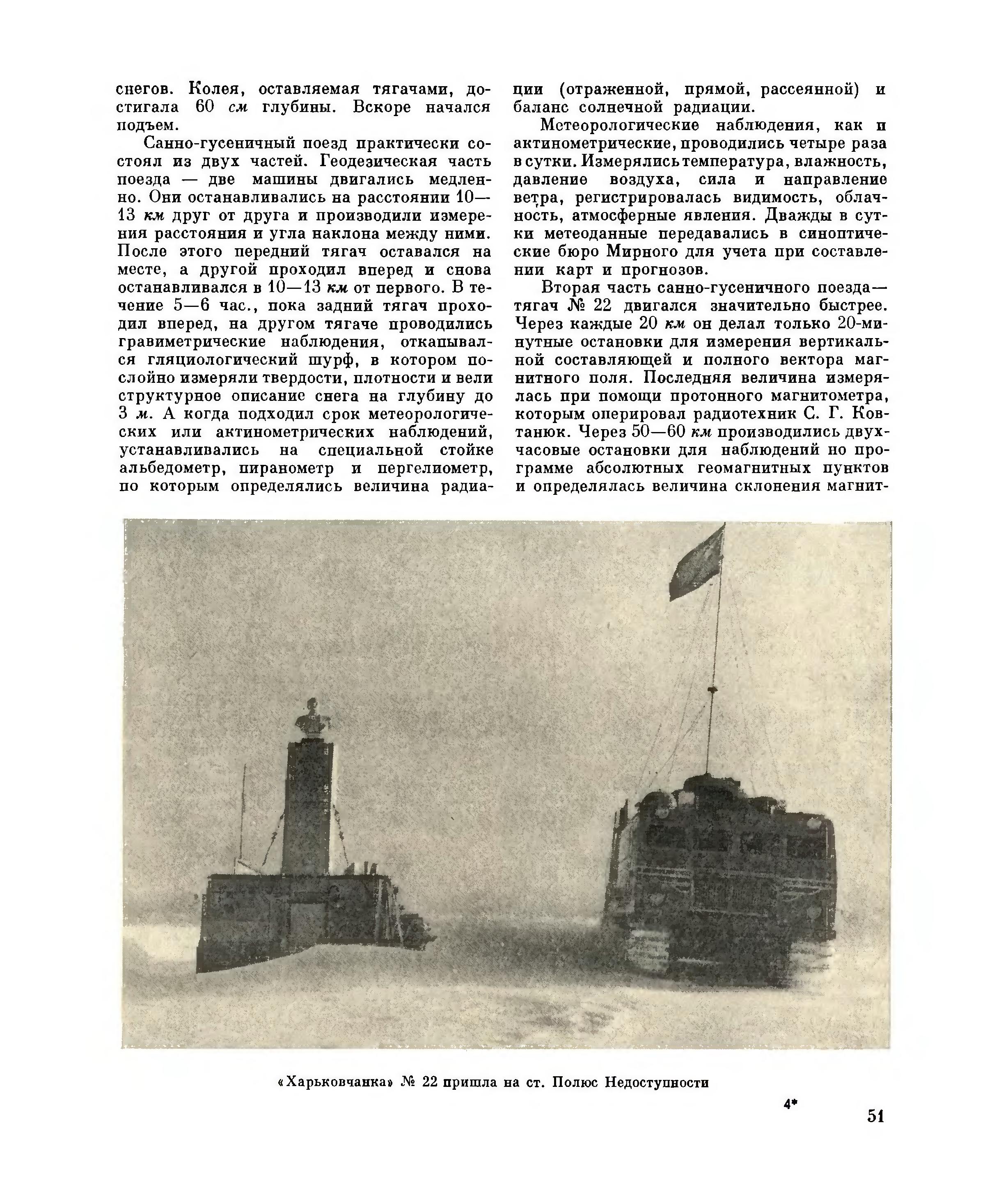 Санно-гусеничный поезд практически состоял из двух частей. Геодезическая часть поезда — две машины двигались медленно. Они останавливались на расстоянии 10— 13 км друг от друга и производили измерения расстояния и угла наклона между ними. После этого передний тягач оставался на месте, а другой проходил вперед и снова останавливался в 10—13 км от первого. В течение 5—6 час., пока задний тягач проходил вперед, на другом тягаче проводились гравиметрические наблюдения, откапывался гляциологический шурф, в котором послойно измеряли твердости, плотности и вели структурное описание снега на глубину до 3 м. А когда подходил срок метеорологических или актинометрических наблюдений, устанавливались на специальной стойке альбедометр, пиранометр и пергелиометр, по которым определялись величина радиации (отраженной, прямой, рассеянной) и баланс солнечной радиации.