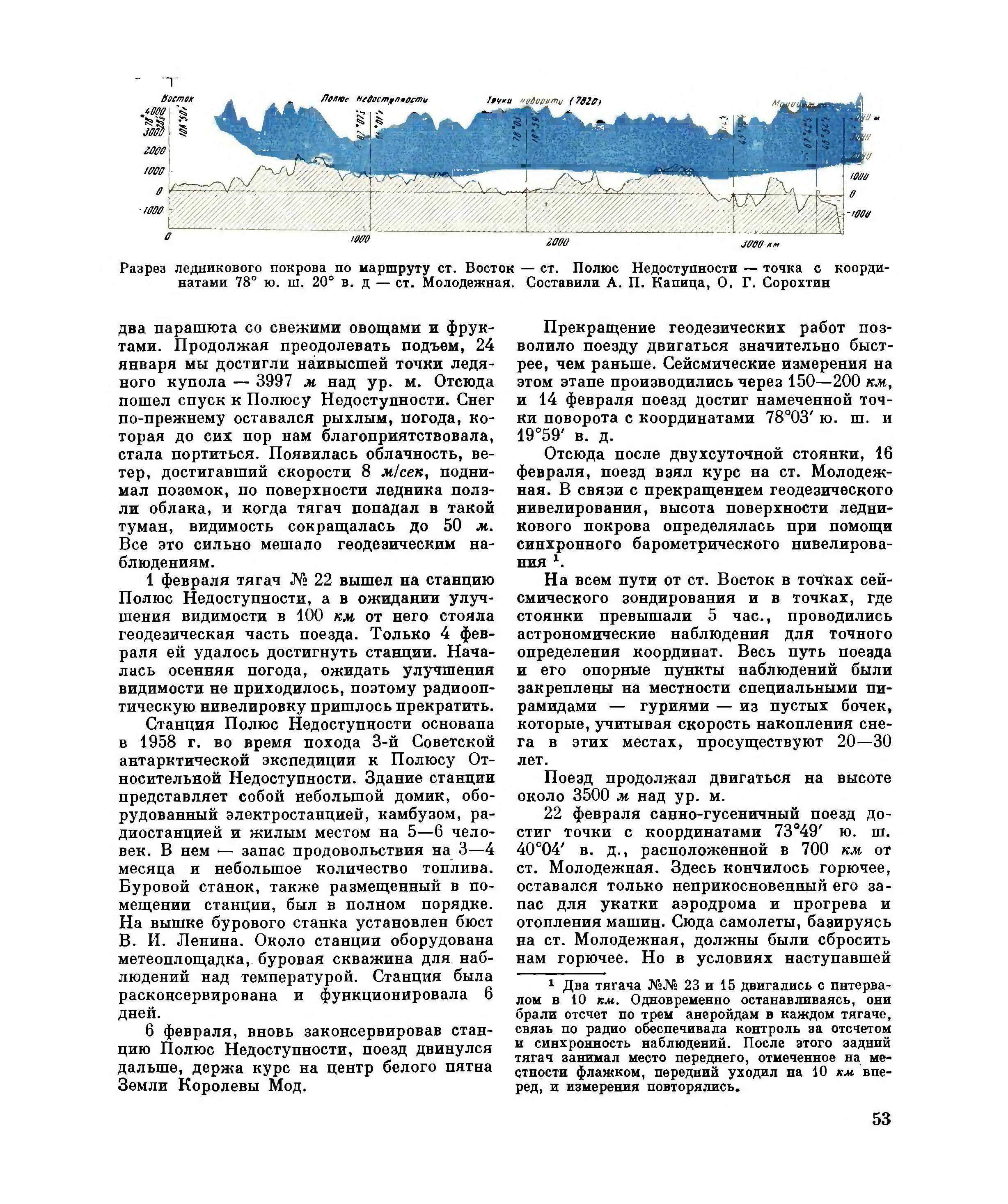 {1} Два тягача №№ 23 и 15 двигались с интервалом в 10 км. Одновременно останавливаясь, они брали отсчет по трем анероидам в каждом тягаче, связь по радио обеспечивала контроль за отсчетом и синхронность наблюдений. После этого задний тягач занимал место переднего, отмеченное на местности флажком, передний уходил на 10 км вперед, и измерения повторялись.На всем пути от ст. Восток в точках сейсмического зондирования и в точках, где стоянки превышали 5 час., проводились астрономические наблюдения для точного определения координат. Весь путь поезда и его опорные пункты наблюдений были закреплены на местности специальными пирамидами — гуриями — из пустых бочек, которые, учитывая скорость накопления снега в этих местах, просуществуют 20—30 лет.