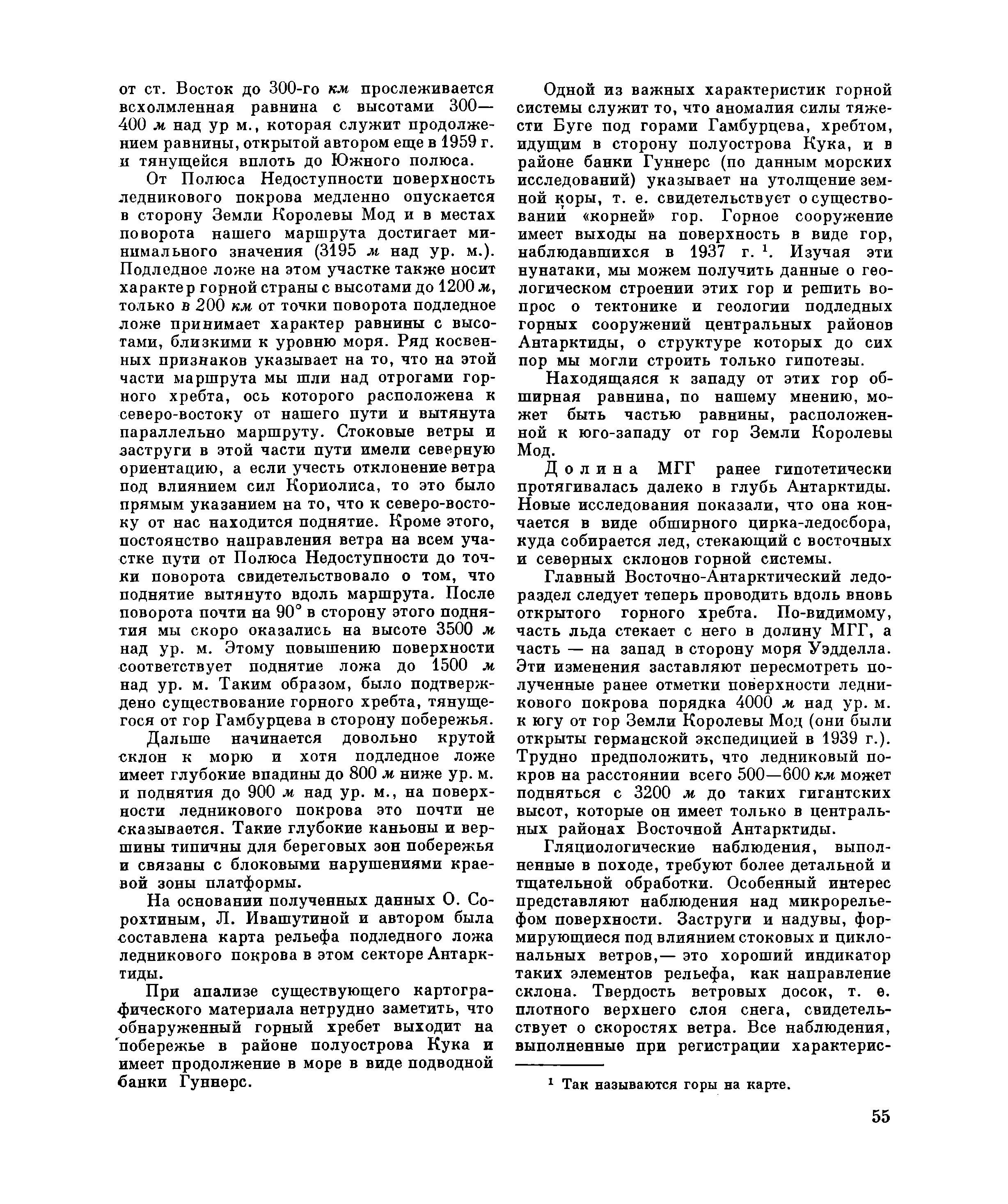 Главный Восточно-Антарктический ледо- раздел следует теперь проводить вдоль вновь открытого горного хребта. По-видимому, часть льда стекает с него в долину МГГ, а часть — на запад в сторону моря Уэдделла. Эти изменения заставляют пересмотреть полученные ранее отметки поверхности ледникового покрова порядка 4000 м над ур. м. к югу от гор Земли Королевы Мод (они были открыты германской экспедицией в 1939 г. ). Трудно предположить, что ледниковый покров на расстоянии всего 500—600 км может подняться с 3200 м до таких гигантских высот, которые он имеет только в центральных районах Восточной Антарктиды.