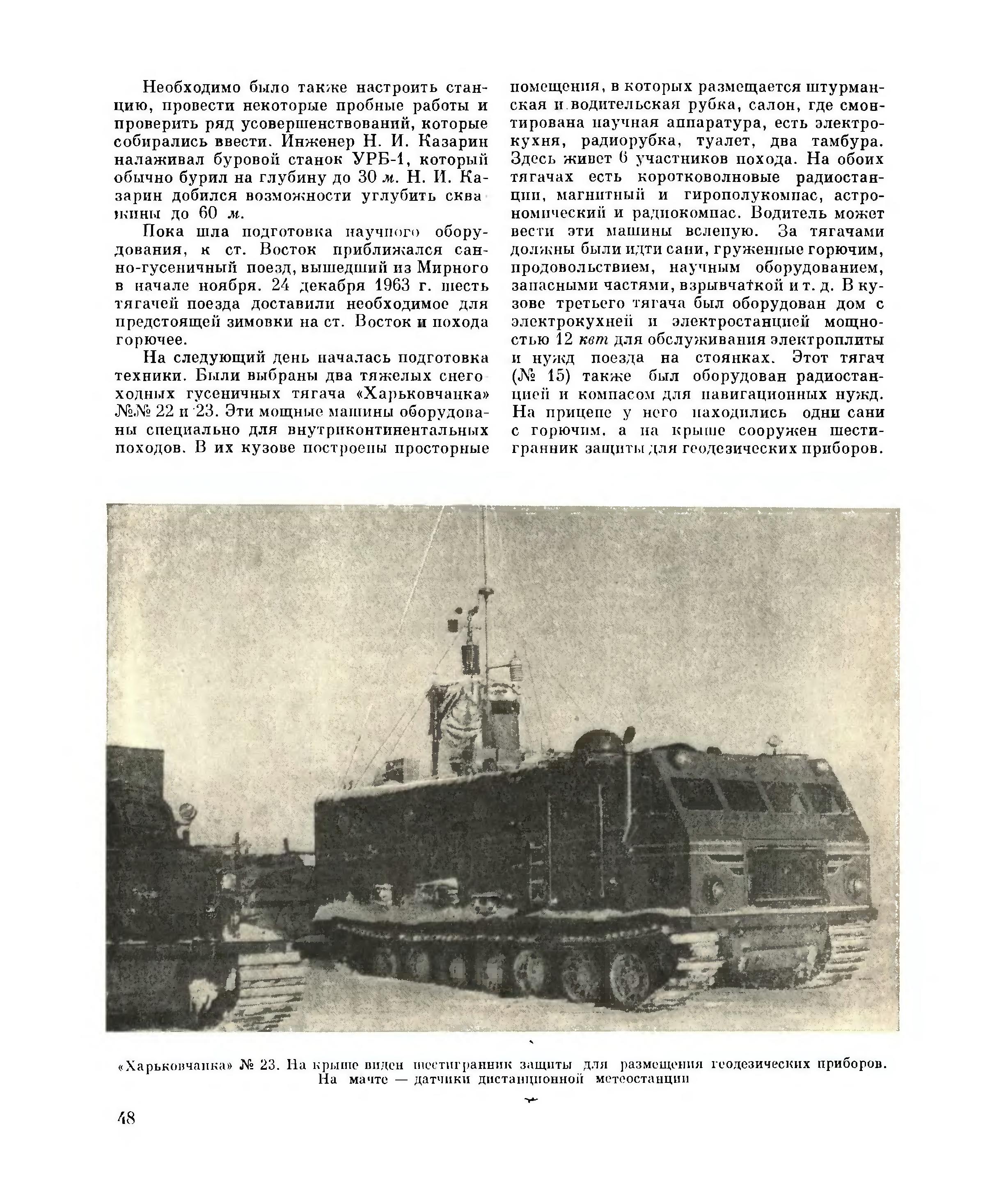 На следующий день началась подготовка техники. Были выбраны два тяжелых снегоходных гусеничных тягача «Харьковчанка» №№ 22 и 23. Эти мощные машины оборудованы специально для внутрнконтинентальных походов. В их кузове построены просторные помещения, в которых размещается штурманская и водительская рубка, салон, где смонтирована научная аппаратура, есть электрокухня, радиорубка, туалет, два тамбура. Здесь живет 6 участников похода. На обоих тягачах есть коротковолновые радиостанции, магнитный и гирополукомпас, астрономический и радиокомпас. Водитель может вести эти машины вслепую. За тягачами должны были идти сани, груженные горючим, продовольствием, научным оборудованием, запасными частями, взрывчаткой и т. д. В кузове третьего тягача был оборудован дом с электрокухня и электростанцией мощностью 12 квт для обслуживания электроплиты и нужд поезда на стоянках. Этот тягач (№ 15) также был оборудован радиостанцией и компасом для навигационных нужд. На прицепе у него находились одни сани с горючим, а на крыше сооружен шестигранник защиты для геодезических приборов.