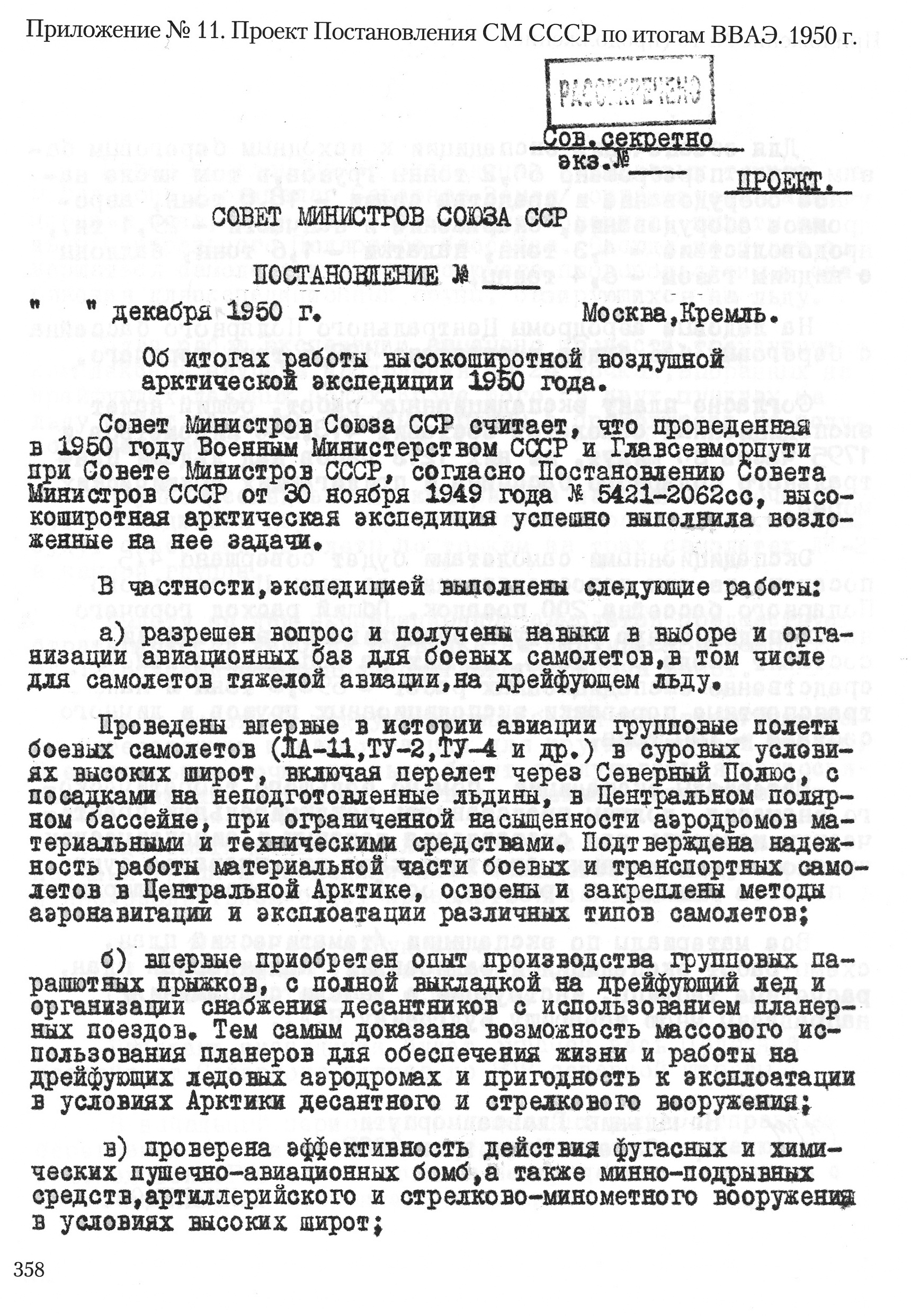 Главсевморпути просит Вашего распоряжения директору завода №51 о безвозмездной передаче УПА одного самолёта Пе-8 для обслуживания ВШ научной экспедиции 1950г.