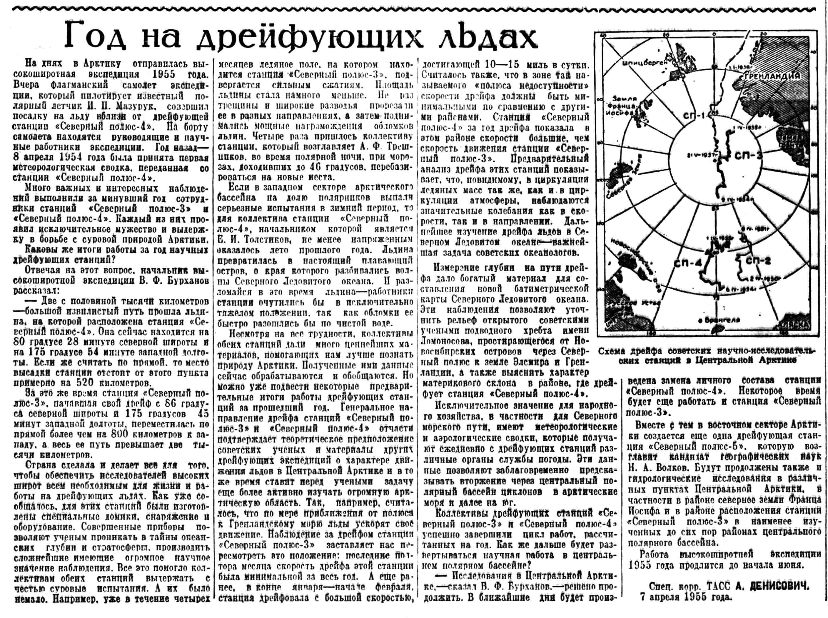 На днях в Арктику отправилась высокоширотная экспедиция 1955 года. Вчера флагманский самолет экспедиция. который пилотирует известный полярный летчик И. П. Мазурук, совершил посадку на льду вблизи от дрейфующей станции «Северный полюс-4». На борту самолета находятся руководящие и научные работники экспедиции. Год назад — 8 апреля 1954 года была принята первая метеорологическая сводка, переданная со станции «Северный полюс-4».