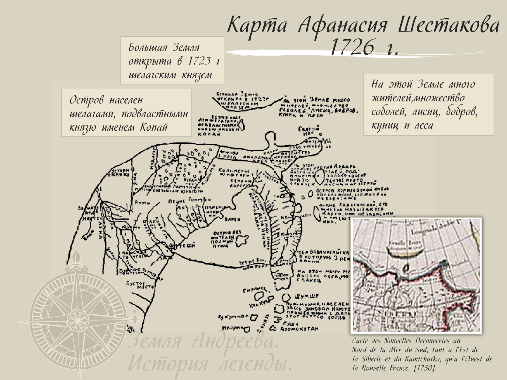 В это же время распространились сведения о земле, якобы открытой шелагским князем Копаем. На карте казацкого головы Афанасия Шестакова в 1726 г. к северо-востоку от устья Колымы был обозначен остров Копаев (по-видимому, один из Медвежьих островов), а к северу от него — Большая земля, открытая в 1723 году принцем Шелагским (т. е. Копаем). (Эта земля позже появится и на других картах, например на карте французского картографа Филлипа Буаше, изданной в 1750 г.)