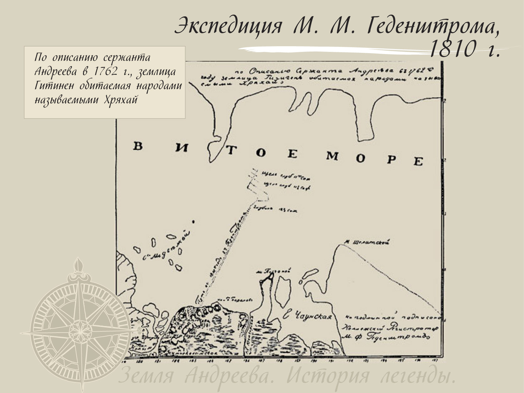 Примечательна запись, сделанная Г. Сарычевым: «Мнение о существовании матерой земли на севере подтверждает бывший 22 июня юго-западный ветер, который дул с жестокостью двои сутки. Силою его, конечно бы, должно унести лед далеко к северу, если б что тому не препятствовало; вместо того на другой же день увидели мы все море, покрытое льдом. Капитан Шмалев сказывал мне, что он слышал от чукоч о матерой земле, лежащей к северу, не в дальнем расстоянии от Шалагского Носа, что она обитаема и что шалагские чукчи зимнею порою в одни сутки переезжают туда по льду на оленях».