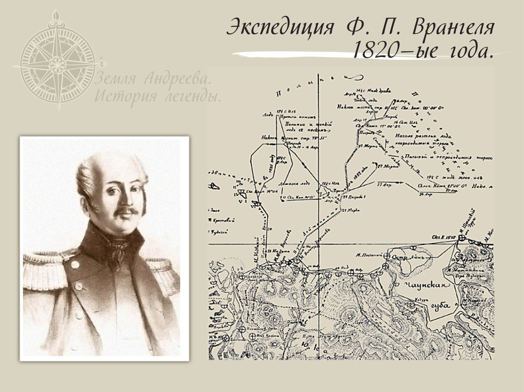 В 1821—1823 годах Врангель совершил три поездки по льду в северном и северо-восточном направлениях. Ни земли, ни признаков ее во время этих поездок усмотрено не было, поэтому Врангель сделал вывод о том, что "в удободосягаемом от азиатского берега расстоянии нет на Ледовитом море никакой земли". Во время последней поездки, предпринятой в 1823 году, Врангель повстречал чукчей и спросил их, не существует ли какая-нибудь земля на море к северу от чукотских берегов.