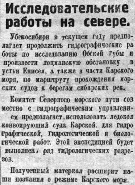 В текущем году экспедиция займется исследованием Малыгина пролива, который должен значительно сократить Северный морской путь, и подысканием места для постройки новой радиостанции на о. Белом. В обычные задания экспедиции входит снабжение уже существующих северных радиостанций продовольствием и сменой личного состава, а также встреча и сопровождение судов, которые выйдут из Омска и Новониколаевска для товарообмена с Англией.