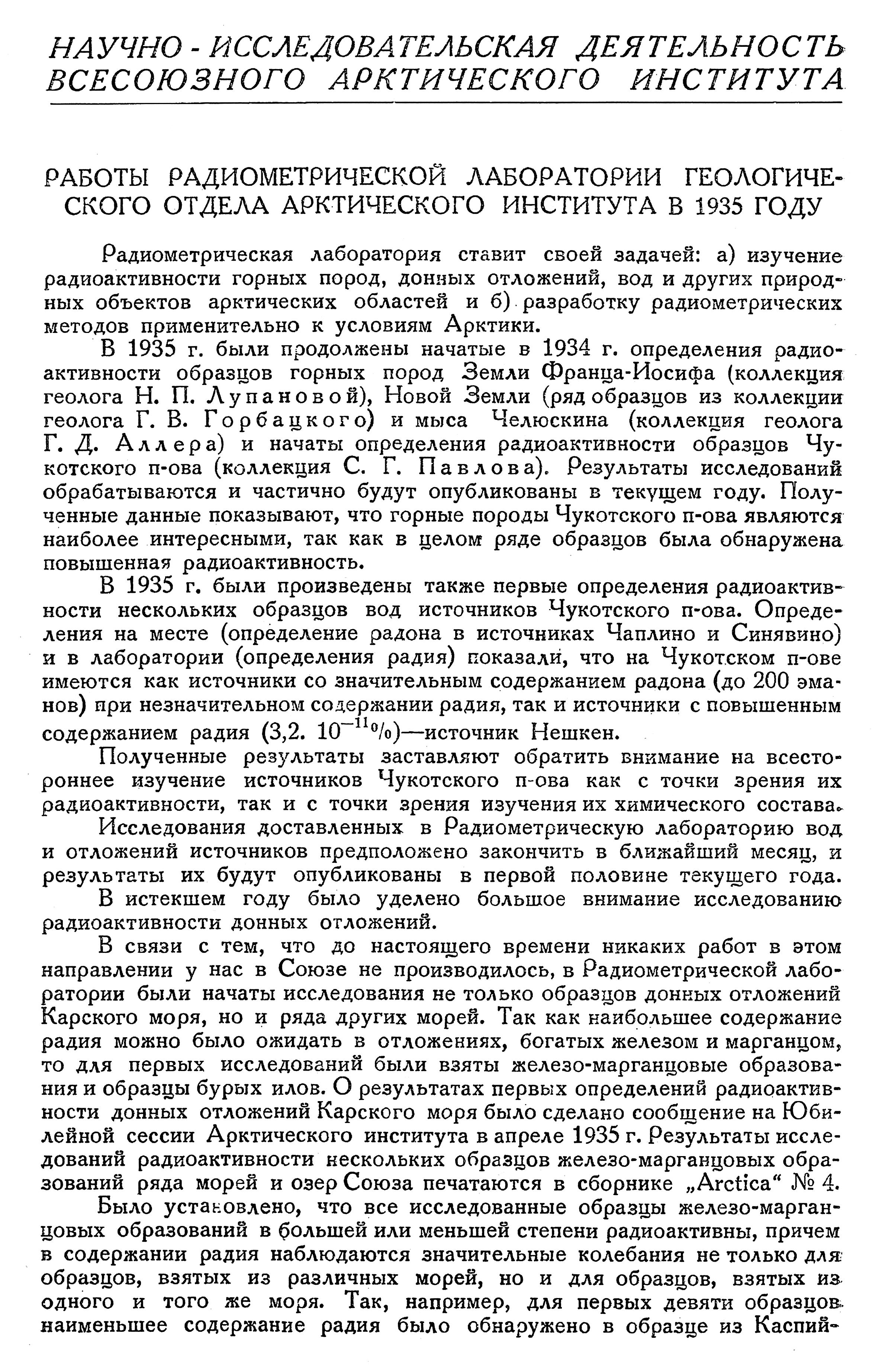 В 1935 г. были продолжены начатые в 1934 г. определения радиоактивности образцов горных пород Земли Франца-Иосифа (коллекция геолога Н. П. Лупановой), Новой Земли (ряд образцов из коллекции геолога Г. В. Горбацкого) и мыса Челюскина (коллекция геолога Г. Д. Аллера) и начаты определения радиоактивности образцов Чукотского п-ова (коллекция С. Г. Павлова). Результаты исследований обрабатываются и частично будут опубликованы в текущем году. Полученные данные показывают, что горные породы Чукотского п-ова являются наиболее интересными, так как в целом ряде образцов была обнаружена повышенная радиоактивность.