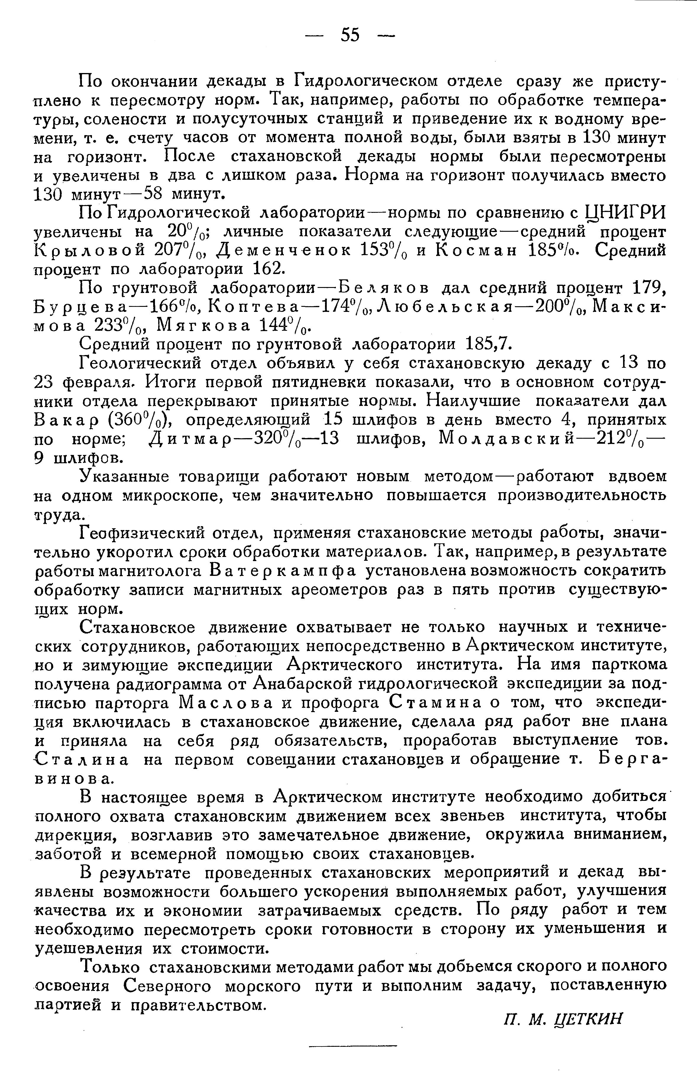 Начальник Политуправления Северного морского пути т. С. А. Бергавинов в своей статье „Стахановское движение в Арктике" („Советская Арктика", № 1, 1936 г.) дает яркие примеры того, как подхвачено это дело в различных звеньях полярной работы. Стахановским методом работы охвачены не только техники-производственники, но и научно-исследовательские кадры —„Зимовщики Матшара, включившись в стахановское движение, взяли на себя обязательство выполнить двухлетнюю программу гидрологических работ в полтора года, уплотнить работу радиопередач на основе спаренной работы радиста и механика. Стахановцами Арктики, овладевшими техникой своего дела, являются начальники полярных станций тт. Званцев, Папанин, начальник радиоцентра на Диксоне т. Ходов". (С. А. Бергавинов.)