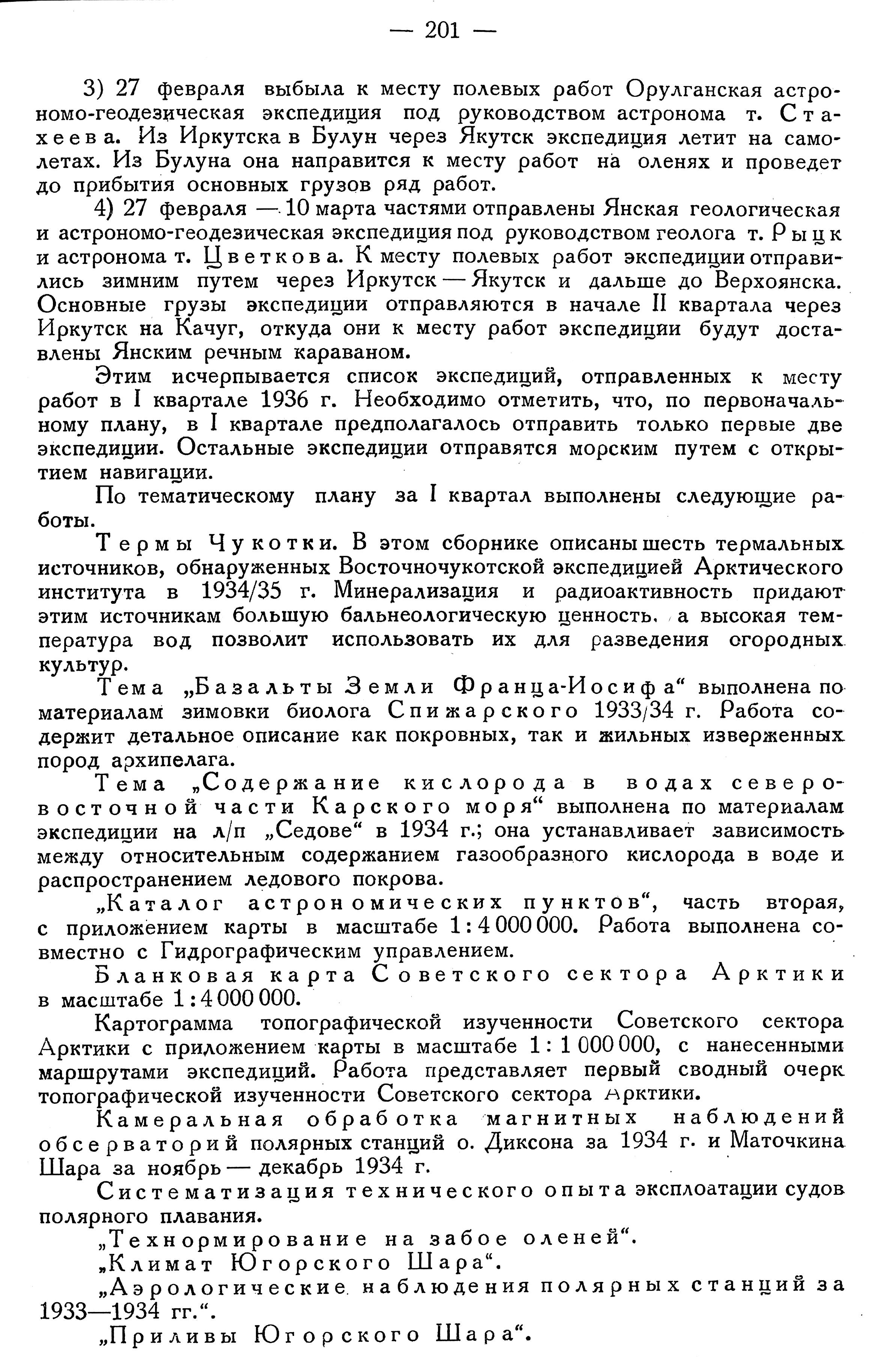 В заключение необходимо указать, что помимо всех этих работ в 1936 г. топографами, входящими в состав геологических, гидрологических и других экспедиций Арктического института, будут произведены съемки и другие геодезические работы, что даст возможность в 1936/37 г. еще шире осветить с картографической стороны изучаемый сектор Советской Арктики.