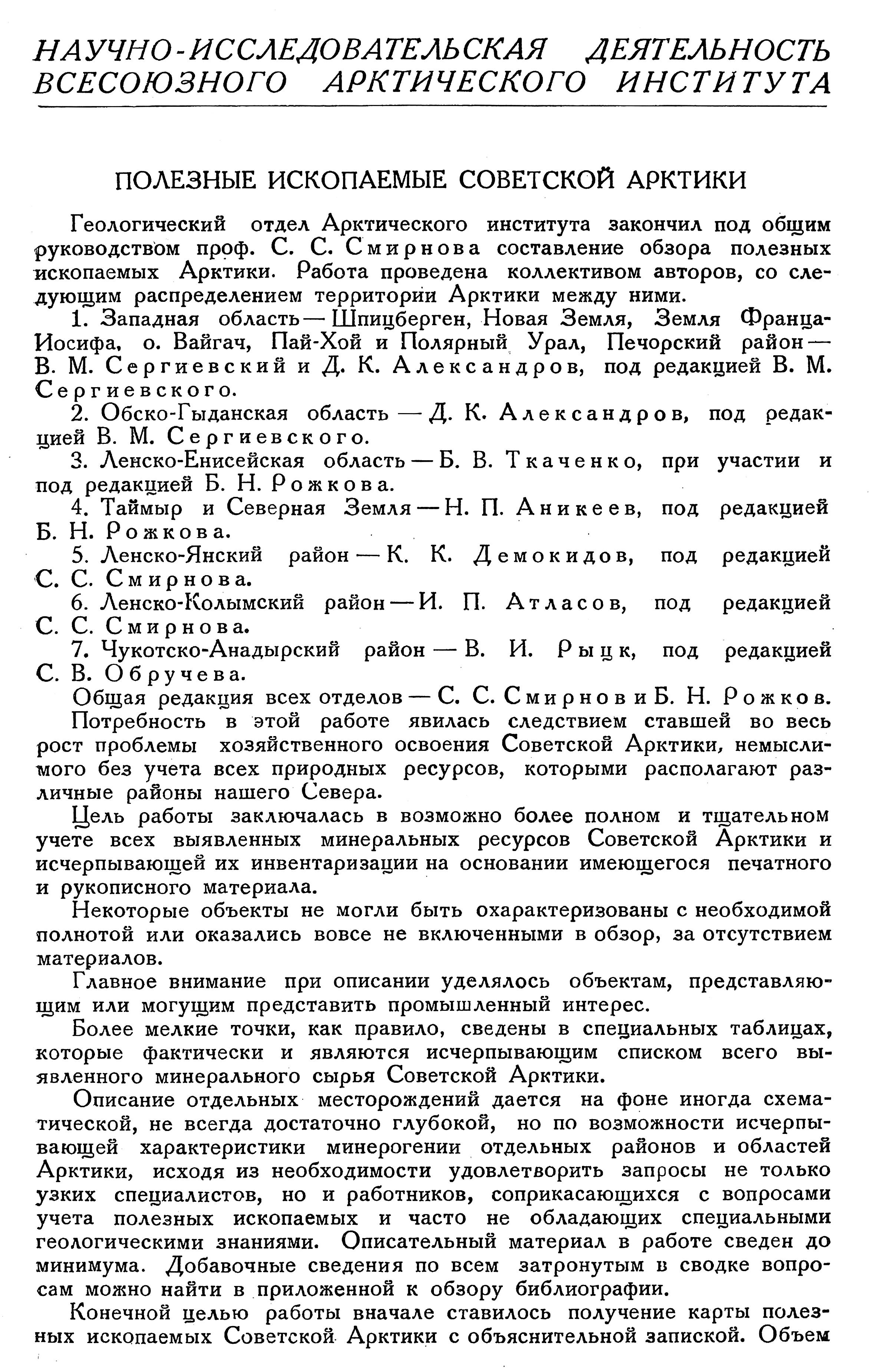 Геологический отдел Арктического института закончил под общим руководством проф. С. С. Смирнова составление обзора полезных ископаемых Арктики. Работа проведена коллективом авторов, со следующим распределением территории Арктики между ними.