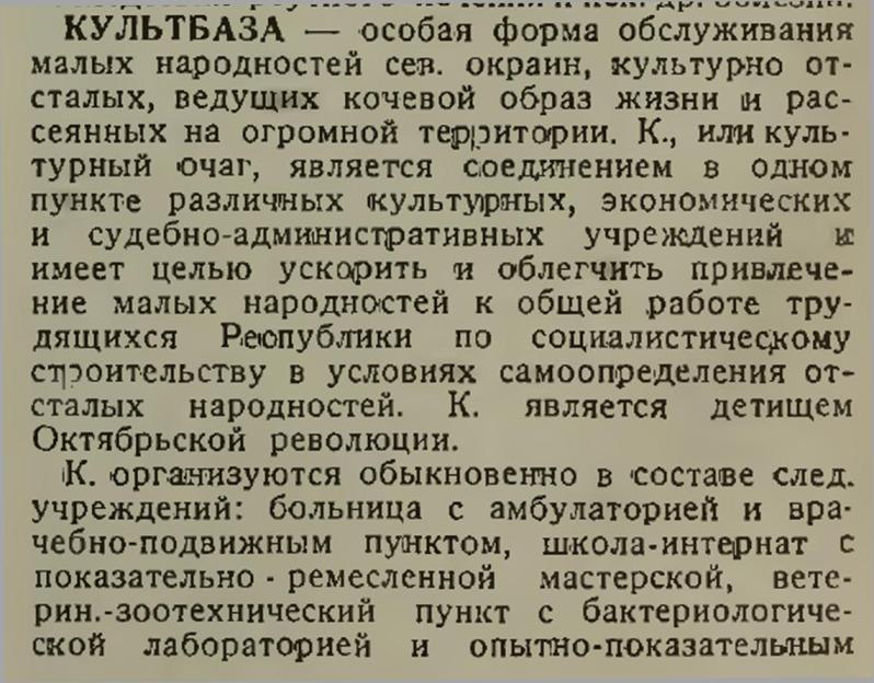 28 Комитетом Севера были открыты следующие культбазы: Хаседа-Хард, Ярсале и Хальмер-Сэдэ (для большеземельских и ямальских ненцев и тазовских ненцев и селькупов), Сосвинская (для вогулов), Казымекая (для остяков). Туринская, Устъ- Калаканская, Усть-Майская и Чумикаяская (для енисейских, витимо-олекминских, алдано-майских и чумикатаских тунгусов), Хатангская (для долган и нганасан), Нагаевская (ламутская), Сахалинская (для гиляков, ороков, тунгусов), Пенжинская (корякская), Чаунская и Вилюнейская (для одноименных чукчей), Чукотская — в бухте Лаврентия ;(для чукчей и эскимосов).