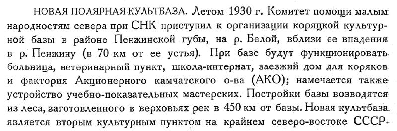 НОВАЯ ПОЛЯРНАЯ КУЛЬТБАЗА. Летом 1930 г. Комитет помощи малым, народностям севера при СНК приступил к организации коряцкой культурной базы в районе Пенжинской губы, на р, Белой, вблизи ее впадения в р. Пенжину (в 70 км от ее устья). При базе будут функционировать больница, ветеринарный пункт, школа-интернат, заезжий дом для коряков и фактория Акционерного камчатского о-ва (АКО); намечается также устройство учебно-показательных мастерских. Постройки базы возводятся из леса, заготовленного в верховьях рек в 450 км от базы. Новая культбаза является вторым культурным пунктом на крайнем северо-востоке СССР.
