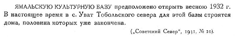 ЯМАЛЬСКУЮ КУЛЬТУРНУЮ БАЗУ предположено открыть весною 1932 г. В настоящее время в с. Уват Тобольского севера для этой базы строятся дома, половина которых уже закончена.