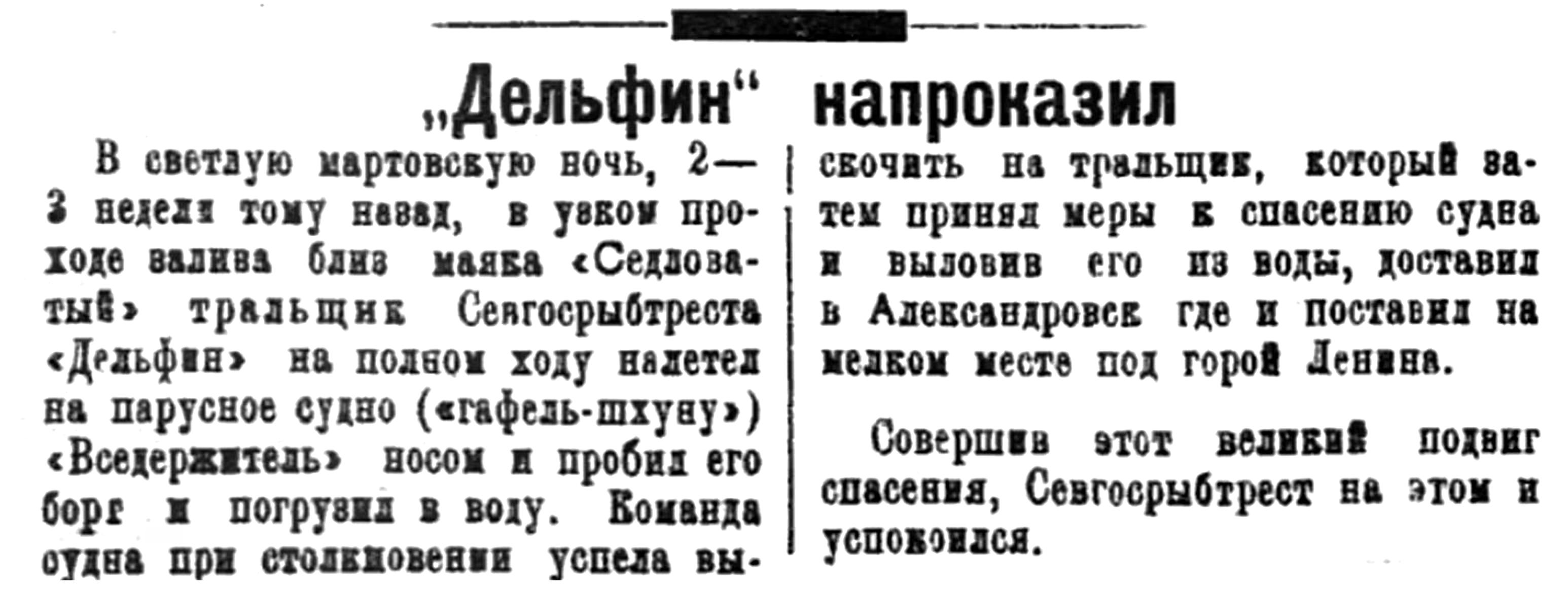 В светлую мартовскую ночь, 2-3 недели тому назад, в узком проходе залива близ маяка "Седловатый" тральщик Севгосрыбтреста "Дельфин" на полном ходу налетел на парусное судно ("гафель-шхуну") "Вседержитель" носом и пробил его борт и погрузил в воду. Команда судна при столкновении успела выскочить на тральщик, который затем принял меры к спасению судна и выловив его из воды, доставил в Александровск где и поставил на мелком месте под горой Ленина.