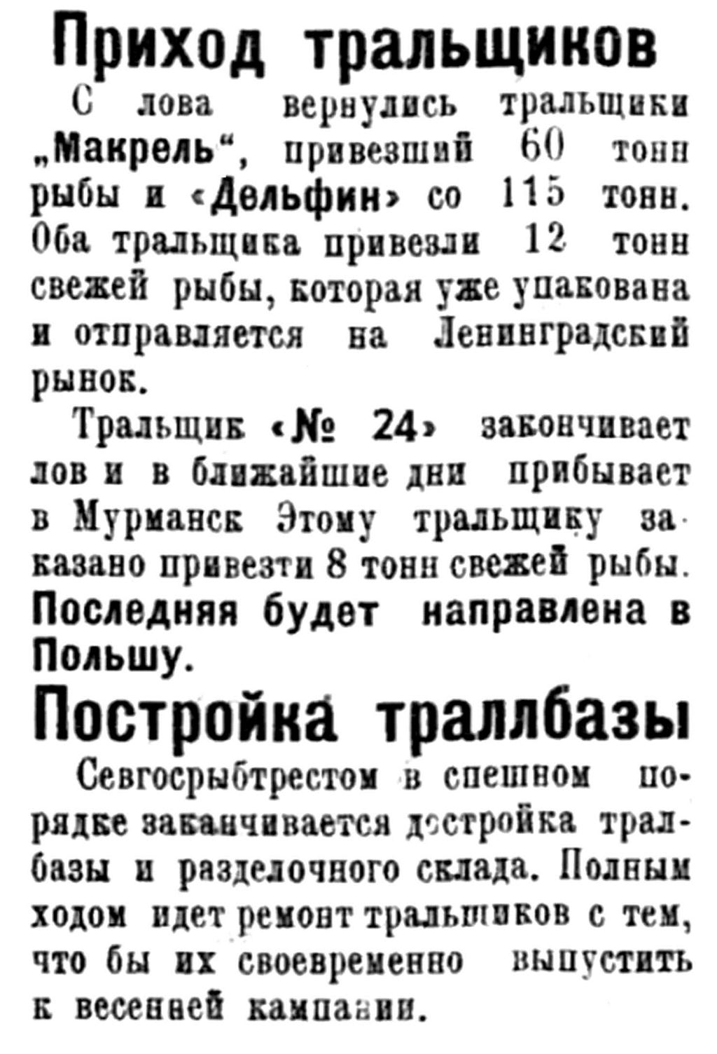 Севгосрыбтрестом в спешном порядке заканчивается достройка тралбазы и разделочного склада. Полным ходом идет ремонт тральщиков с тем, что бы их своевременно выпустить к весенней кампании.