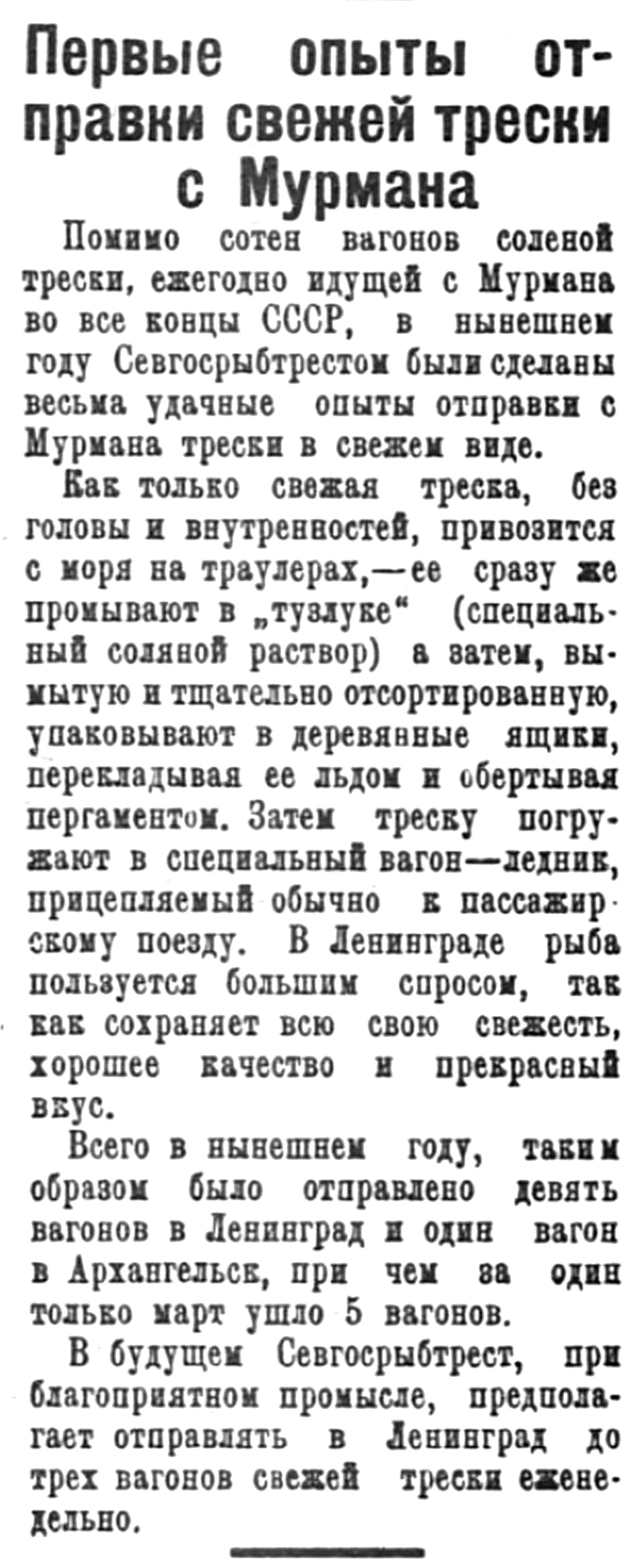 Помимо сотен вагонов соленой трески, ежегодно идущей с Мурмана во все концы СССР, в нынешнем году Севгосрыбтрестом были сделаны весьма удачные опыты отправки с Мурмана трески в свежем виде.