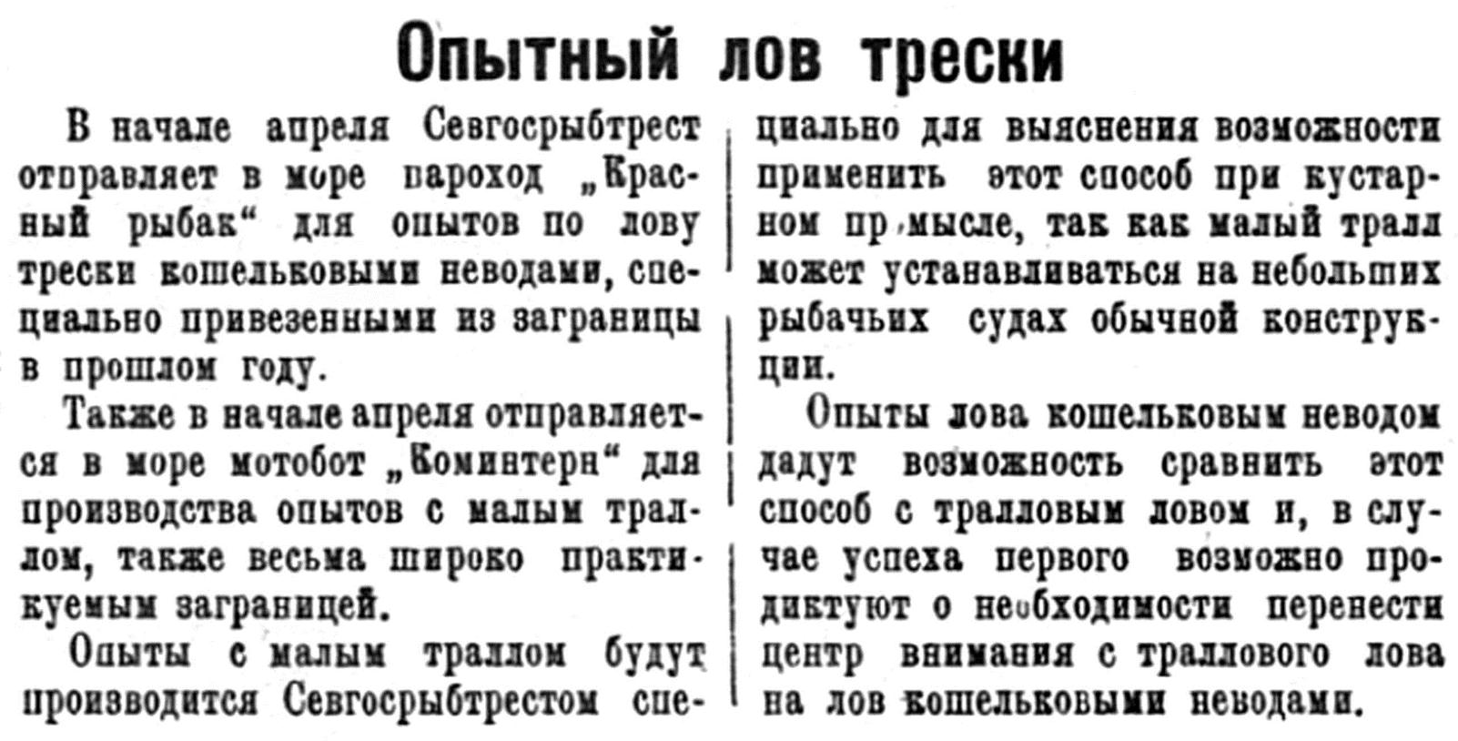 В начале апреля Севгосрыбтрест отправляет в море пароход "Красный рыбак" для опытов по лову трески кошельковыми неводами, специально привезенными из заграницы в прошлом году.