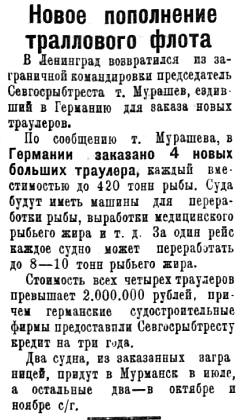 Наряду с постройкой новых траулеров в Германии, Севгосрыбтрест ведет переговоры о постройке траулеров на ленинградских судостроительных заводах. Таким образом, в течение ближайших лет для мурманских рыболовных промыслов будет выстроено до 30 новых траулеров, которые до небывалых еще размеров разовьют на Мурмане тралловый рыболовный промысел.