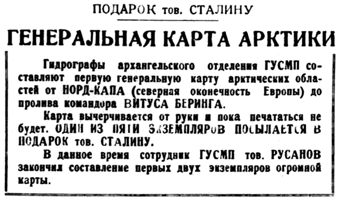 Хаотическая погрузка грузов на пароходы в Архангельске (без документов, в битой таре, со следами хищений, в беспорядке: пакля, спиртные напитки, 20 баллонов с водородом были погружены в один трюм парохода «Сталин» вместе с продуктами и оборудованием для полярных станций) и отсутствие надзора за их сохранностью в пути привели к пожару на пароходе «Сталин». Огнем и водою уничтожено до 400 т ценных грузов. Своевременное изъятие из трюма баллонов с водородом предотвратило катастрофу. По проверяющимся данным ТО ОГПУ пожар был следствием поджога.