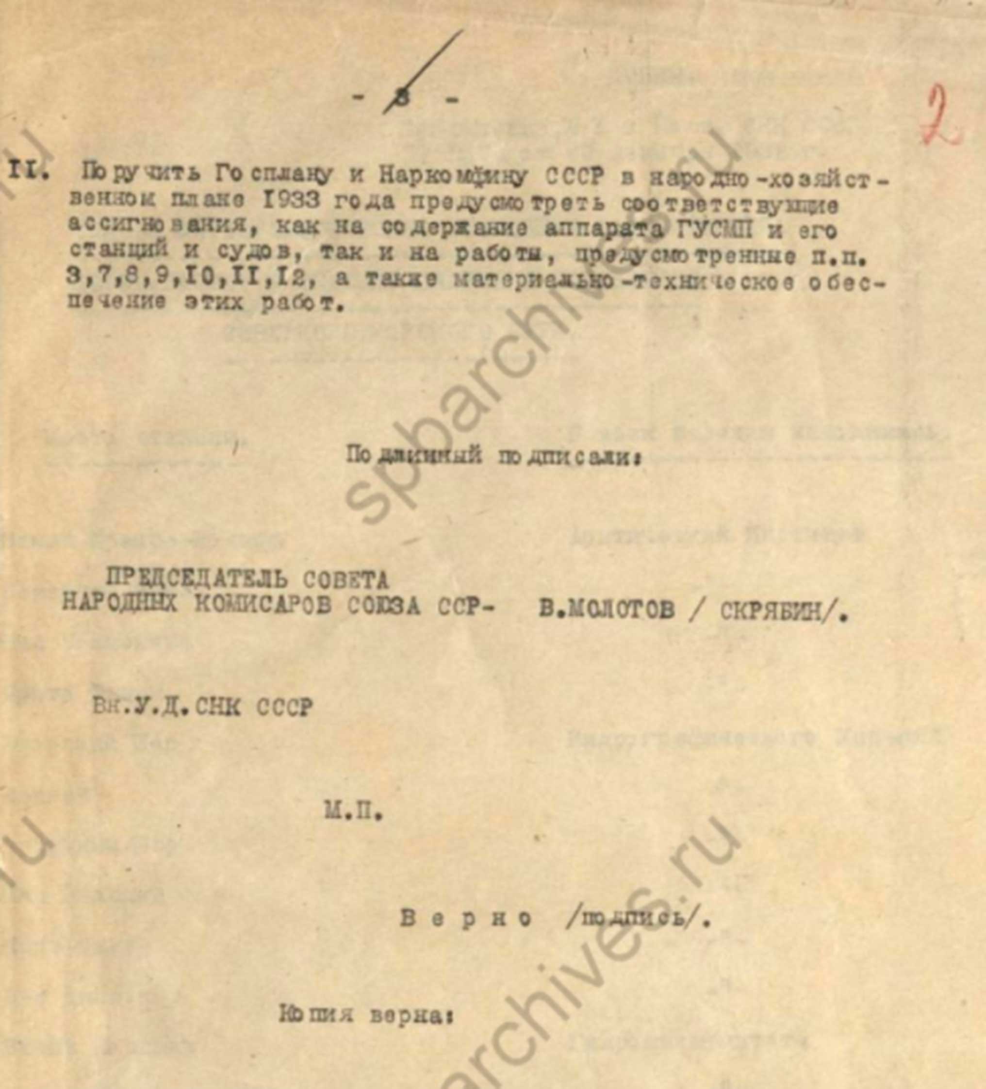 2. Речная часть экспедиции характеризовалась подбором классовочуждых элементов среди руководящего состава (Перельман и его помощники Широков, Матвеев); экспортный груз был погружен на водотечные баржи, разбазаривались и присваивались товаро-продуктовые представительские фонды, причем, в Новом Порту (место обмера экспорта и импорта) на теплоходе «Сибкрайком ВКП(б)» под видом банкета была устроена пьяная оргия совместно с иностранцами.