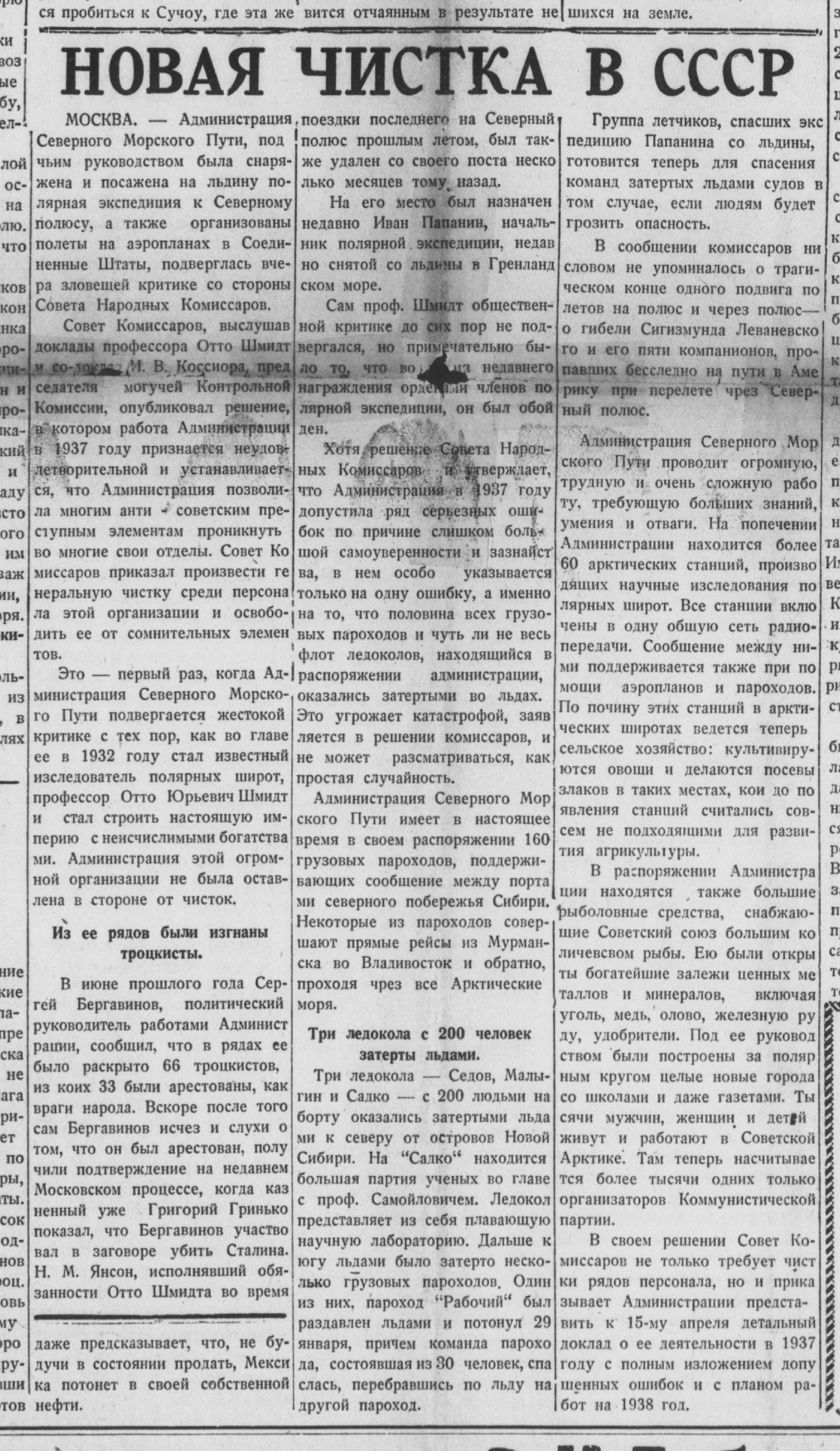 Как известно, в конце сентября пароход был зажат тяжелыми льдами в районе о. Колючин. По данным ТО ОГПУ, в момент, когда это случилось, недалеко от Колючина находился ледокол «Литке», предложивший свою помощь, которую О.Ю. Шмидт почему-то отклонил.