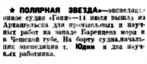 ♦ "ПОЛЯРНАЯ ЗВЕЗДА" — экспедиционное судно "Гоин" — 11 июля вышло из Архангельска для промысловых и научных работ на западе Баренцева моря и в Чешской губе. На борту судна начальник экспедиции т. Юдин и два научных сотрудника.