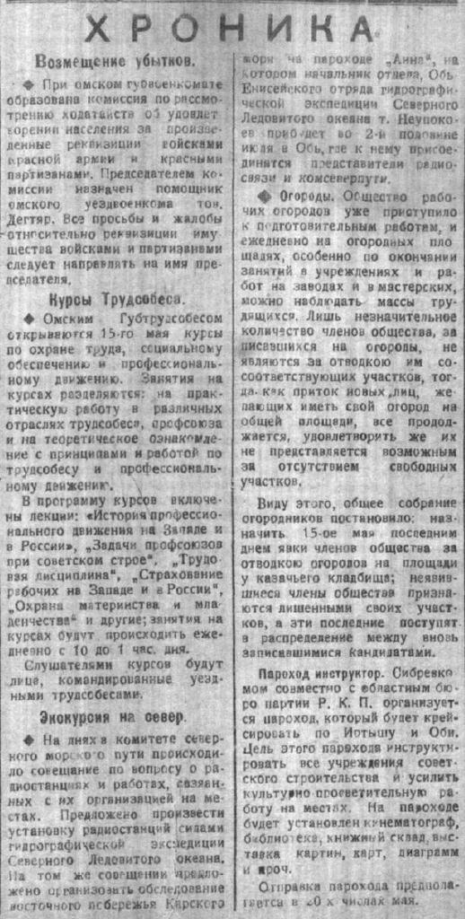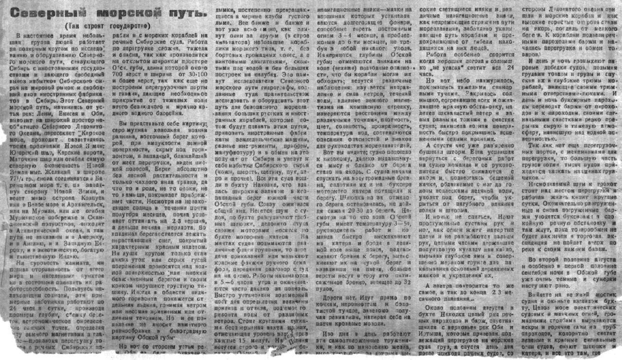 Нужно упомянуть при этом, что в интересах развития транспорта на северном морским пути, Комсеверпути весной 1920 г. поднял вопрос о переброске на Обь и Енисей части судов Архангельской флотилии. Вопрос этот в свое время обсуждался в Междуведомственной Комиссии при Наркомвнешторге и было вынесено постановление о необходимости переброски из Архангельска в Обь и Енисей 9 пароходов и 15 барж-лихтеров, при чем есть надежда на выполнение указанной переброски в нынешнем году, хотя-бы частично.