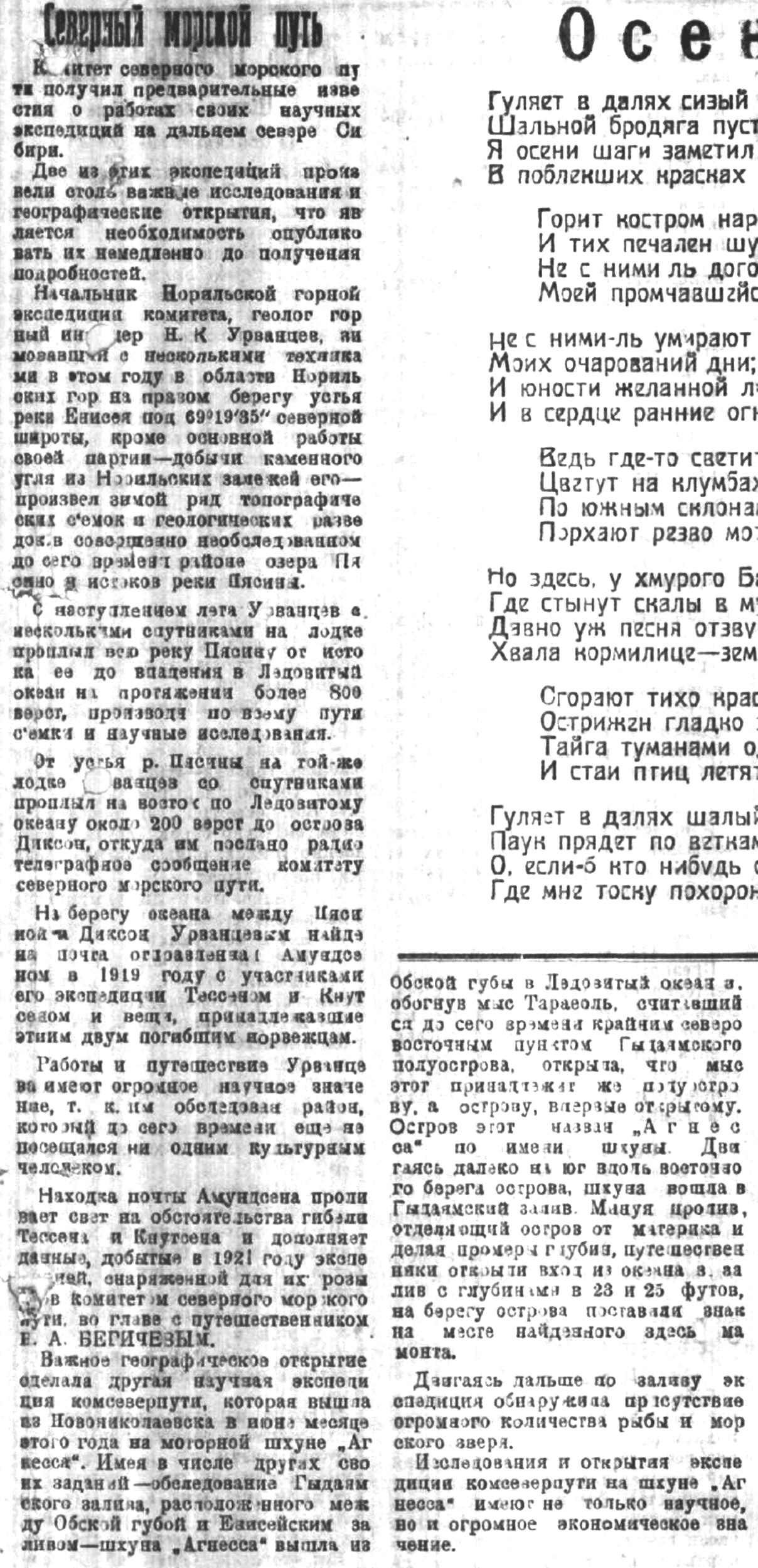 Научным Отделом Комитета поддерживается постоянный контакт с целым рядом ученых учреждений, а также и с отдельными исследователями, работавшими над проблемой Северного Морского пути. В марте настоящего года, по сношению с Наркоминдел, Комитетом организована экспедиция на оленях, под начальством Н. А. Бегичева, жителя Дудинки, знатока Севера, одного из участников экспедиции барона Толля, для розысков спутников Амудсена на западной части Таймырского полуострова. Возвращение этой экспедиции на остров Диксон предполагается в конце июля. Художнику-этнографу, Прокофьеву, командированному Северной экспедицией по сношению с известным писателем-этнографом Богоразом Таном при содействии Комитета в устье Оби, Комсеверпути поручил программное обследование по археологии, согласованное с этнографическими обследованиями, производимыми в других частях Сибирского Севера.