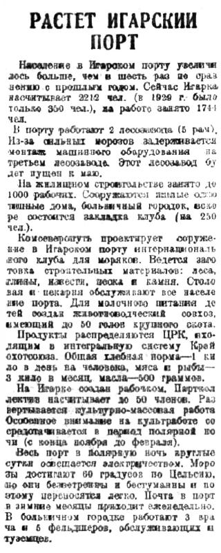 Во избежание погрузки лихтеров строительными материалами, идущими сверху для постройки Усть—Енисейского порта, Комитет еще истекшей зимой организовал в 230 верстах ниже Енисейска, близ села Ярцева, работы по заготовке леса, вырубке ряжей и срубов зданий; эти материалы, в навигацию 1921 г., должны быть переброшены в Усть-Енисейский порт, частью для его собственных построек, частью для построек в Норильском угольном районе, в количестве около 6000 шт.