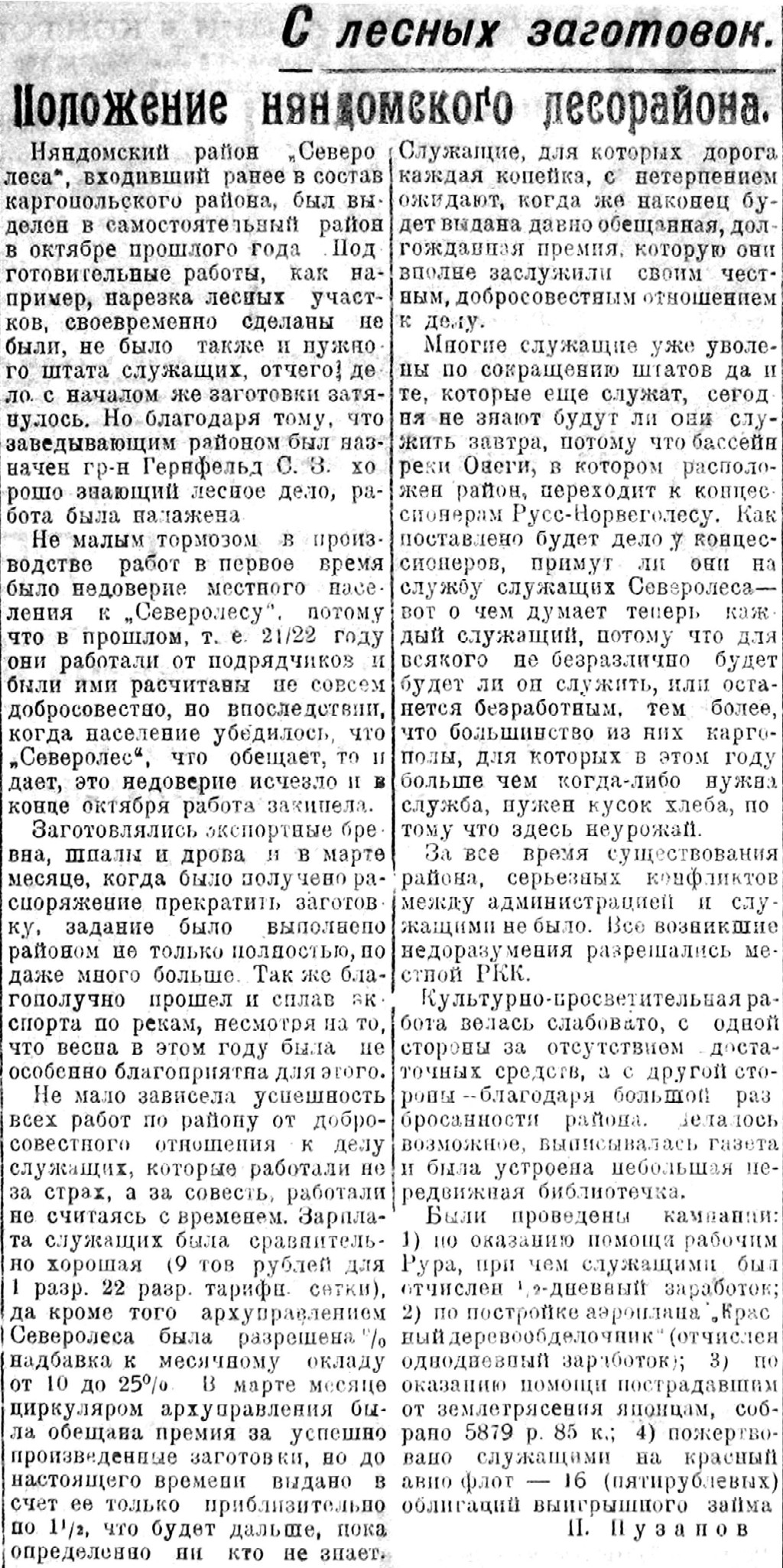 Заработная плата рабочих увеличена, согласно последнему коллективному договору, ив общем имеет тенденцию подняться до довоенных размеров. Больше затруднений имеет место с оплатой самого ответственного технического и административного персонала, но и этот вопрос имеет некоторые виды на благополучное и соответствующее интересам Северолеса разрешение.