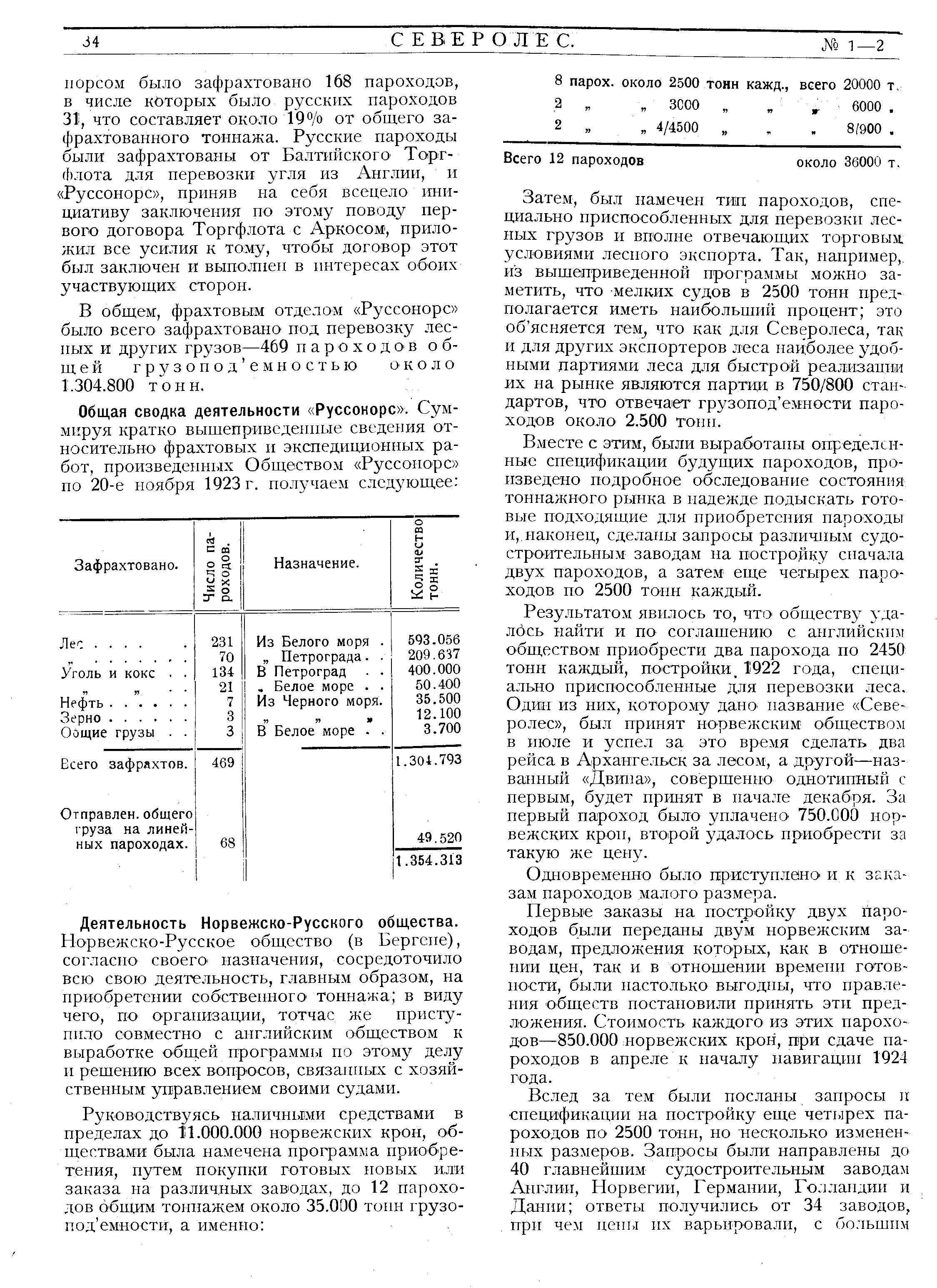 В общем, фрахтовым отделом «Руссонорс» было всего зафрахтовано под перевозку лесных и других грузов — 469 пароходов общей грузоподъемностью около 1.304.800 тонн.