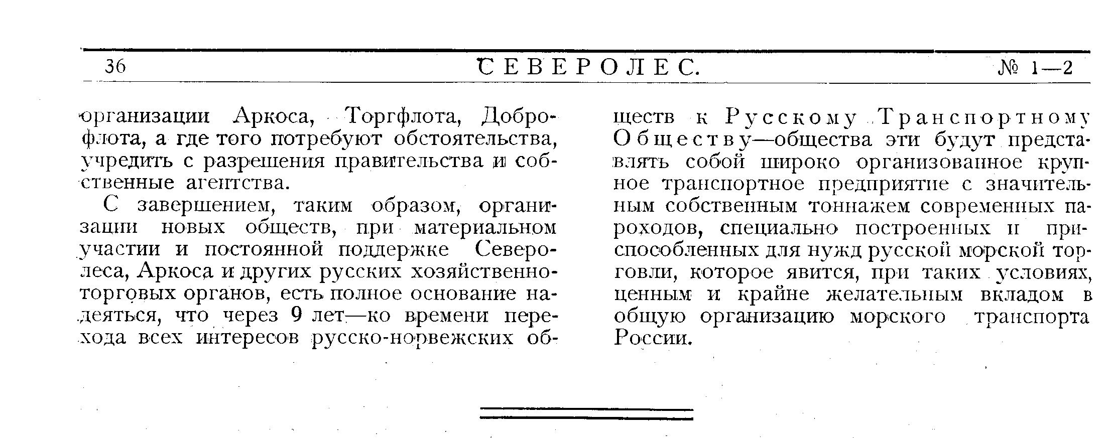 С завершением, таким образом, организации новых обществ, при материальном участии и постоянной поддержке Северолеса, Аркоса и других русских хозяйственноторговых органов, есть полное основание надеяться, что через 9 лет — ко времени перехода всех интересов русско-норвежских об-