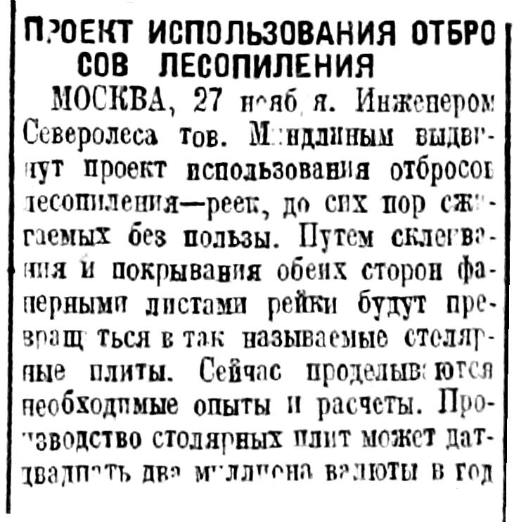 МОСКВА, 27 ноября. Инженером Северолеса тов. Миндлиным выдвинут проект использования отбросов лесопиления — реек, до сих пор сжигаемых без пользы. Путем склеивания и покрывания обеих сторон фанерными листами рейки будут превращаться в так называемые столярные плиты. Сейчас проделываются необходимые опыты и расчеты. Производство столярных плит может дать двадцать два миллиона валюты в год.