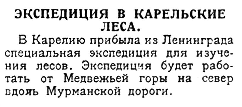 В Карелию прибыла из Ленинграда специальная экспедиция для изучения лесов. Экспедиция будет работать от Медвежьей горы на север вдоль Мурманской дороги.