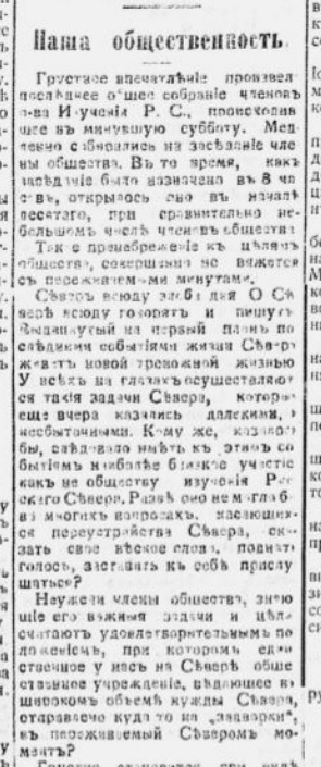 Это общество просуществовало с 1908 по 1917 год и внесло большой вклад в изучение Русского Севера. …В конце XIX - начале ХХ века началось активное изучение, заселение и освоение природных ресурсов Русского Севера. Усилиями архангельских губернаторов А.П.Энгельгардта и