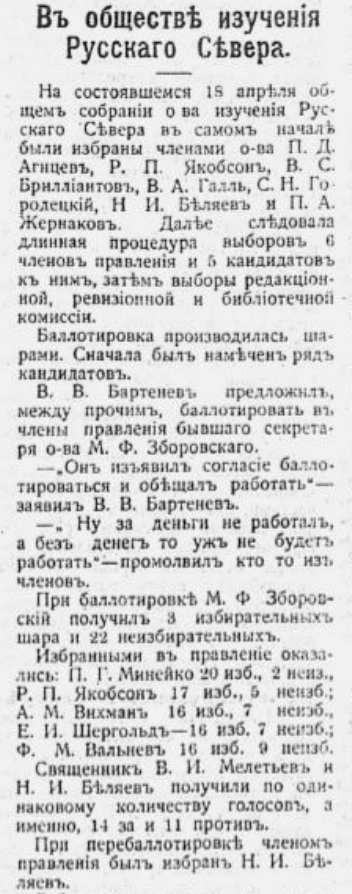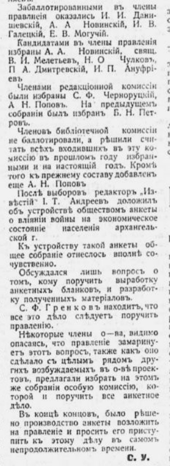 В 1912 году И.В.Сосновский стал одесским градоначальником, но остался членом Общества. Председателем был избран директор мужской гимназии А.Е.Суровцев, а ушедший с этого поста А.Ф.Шидловский сохранил за собой почетное членство {8}. На своих заседаниях Общество продолжало обсуждать насущные вопросы развития северного края: введение земства (доклад Н.В.Мефодиева), организация экспедиций на Новую Землю (доклад Г.Я.Седова), проблемы речного судоходства (доклад Н.В.Преображенского) {9}.