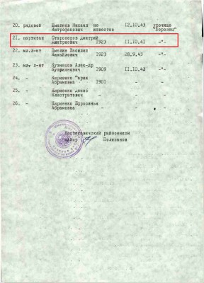 К письму Евгения Николаевна приложила копию до­кумента о том, что «Указом Президиума Верховного Совета СССР от 16 февраля 1942 года Дмитрий Дмит­риевич Староверов за доблесть и мужество, проявлен­ные им в борьбе против гитлеровских захватчиков, на­гражден высшей правительственной наградой — орде­ном Ленина (посмертно)».