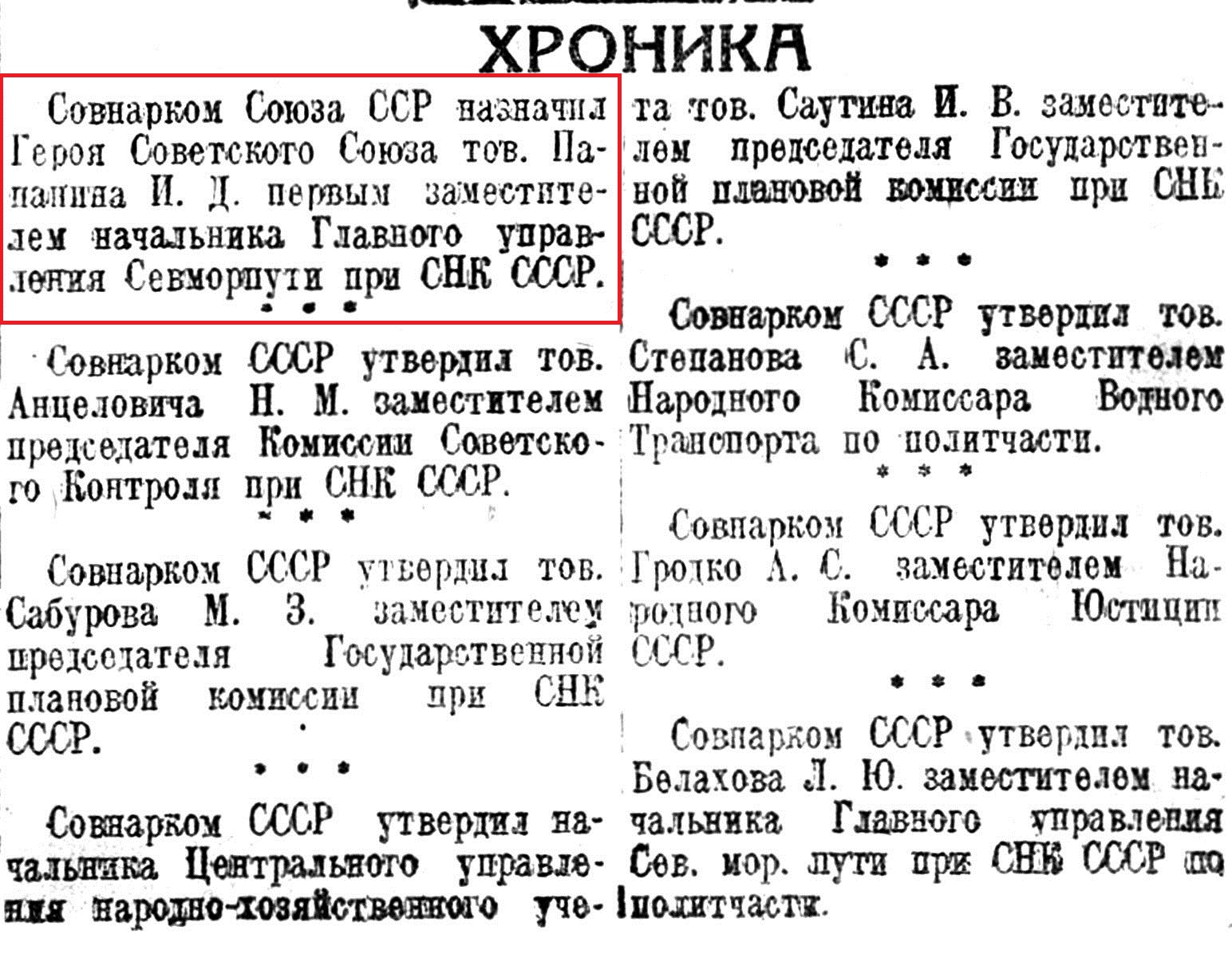 Шевелев М. И. — заместитель начальника Главсевморпути — Герой Советского Союза — ранее награжденный двумя орденами Ленина.