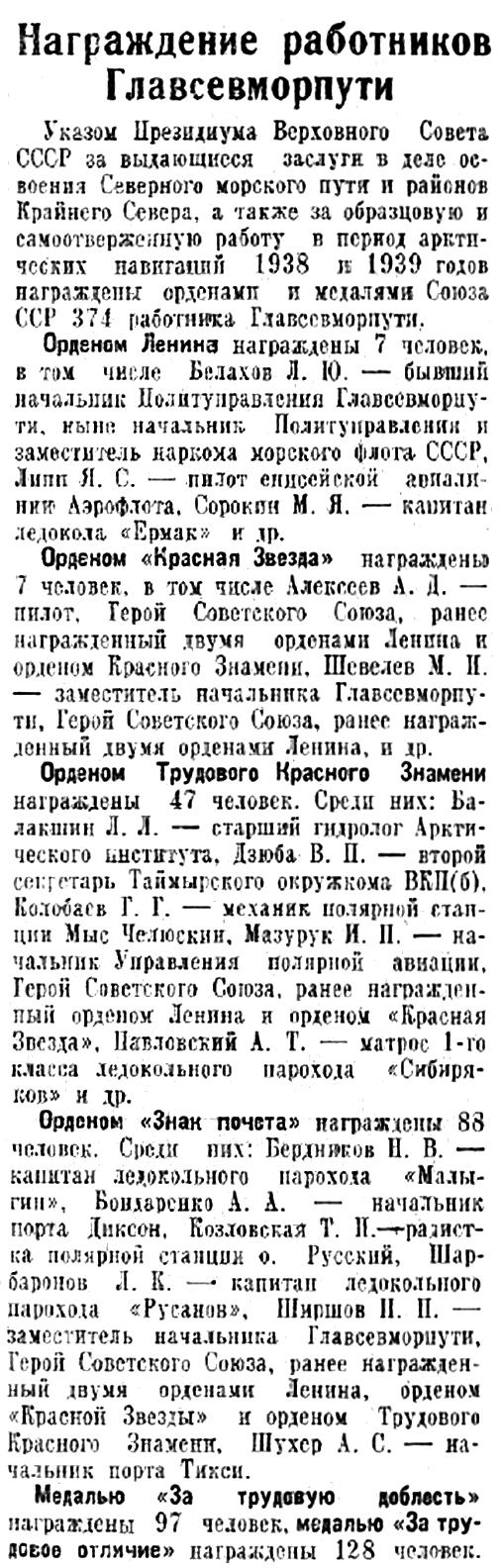 1938 и 1939 годов награждены орденами и медалями Союза ССР 374 работника Главсевморпути.