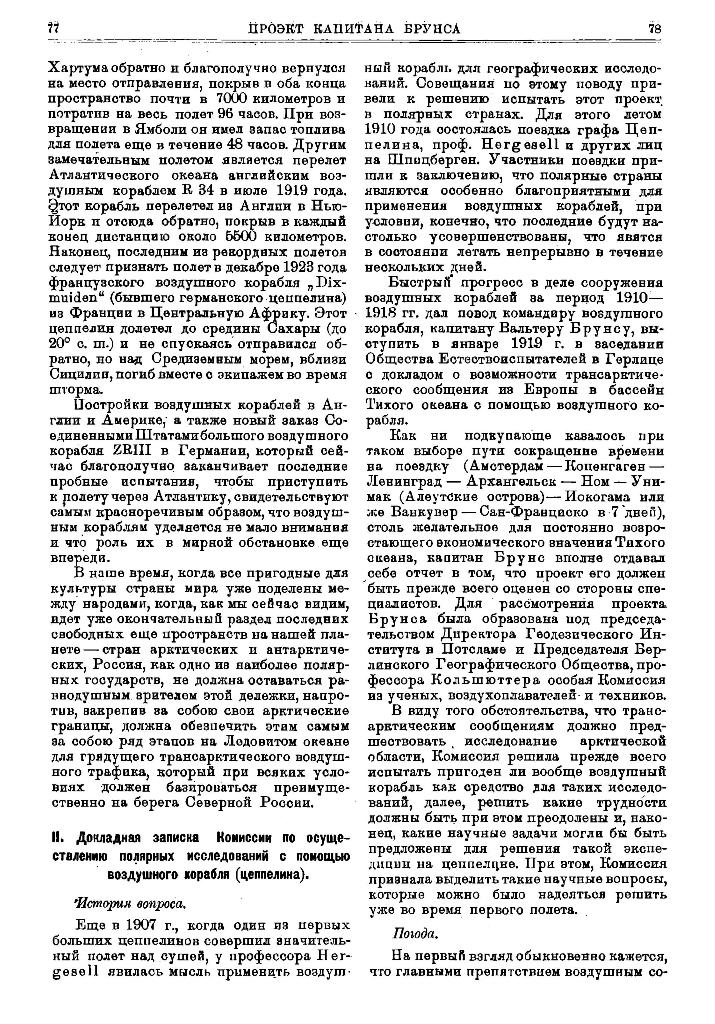 II. Докладная записка Комиссии по осуществлению полярных исследований с помощью воздушного корабля (цеппелина).История вопроса.Еще в 1907 г., когда один из первых больших цеппелинов совершил значительный полет над сушей, у профессора Hergesell явилась мысль применить воздушный корабль для географических исследований. Совещания по этому поводу привели к решению испытать этот проект в полярных странах. Для этого летом 1910 года состоялась поездка графа Цеппелина, проф. Hergesell и других лиц на Шпицберген. Участники поездки пришли к заключению, что полярные страны являются особенно благоприятными для применения воздушных кораблей, при условии, конечно, что последние будут настолько усовершенствованы, что явятся в состоянии летать непрерывно в течение нескольких дней.