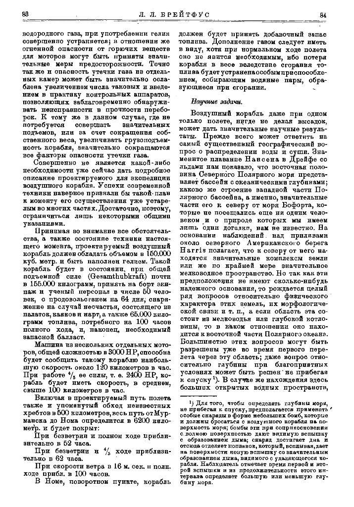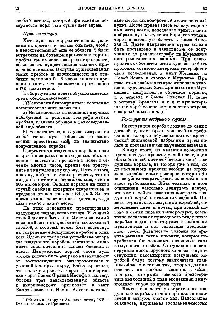Вот почему мы уверены, что нижеизлагаемый проект капитана Брунса, как опирающийся на новейшие завоевания аэронавтики, при своем осуществлении должен внести громадный прогресс во все отрасли, как специально полярных исследований, так и технических оборудований в малодоступных полярных областях, т. к. он даст полную возможность легко и быстро преодолевать огромные трудно-доступные районы и при этом не только производить в них всевозможные исследования, но также и доставлять в любой пункт людей и значительные грузы, как-то: радио — и геофизические станции о полным оборудованием и значительными жизненными запасами и, наконец, спасать людей и ценные грузы с потерпевших крушения судов и т. п.