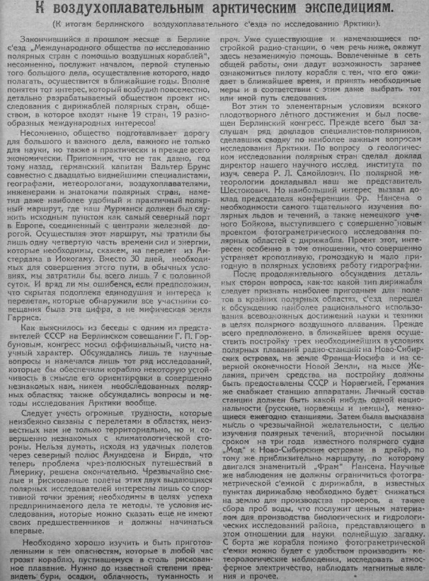ских открытий, но она твердо уверена в том, что для выяснения состояния полярных условий значение воздушного корабля весьма велико.