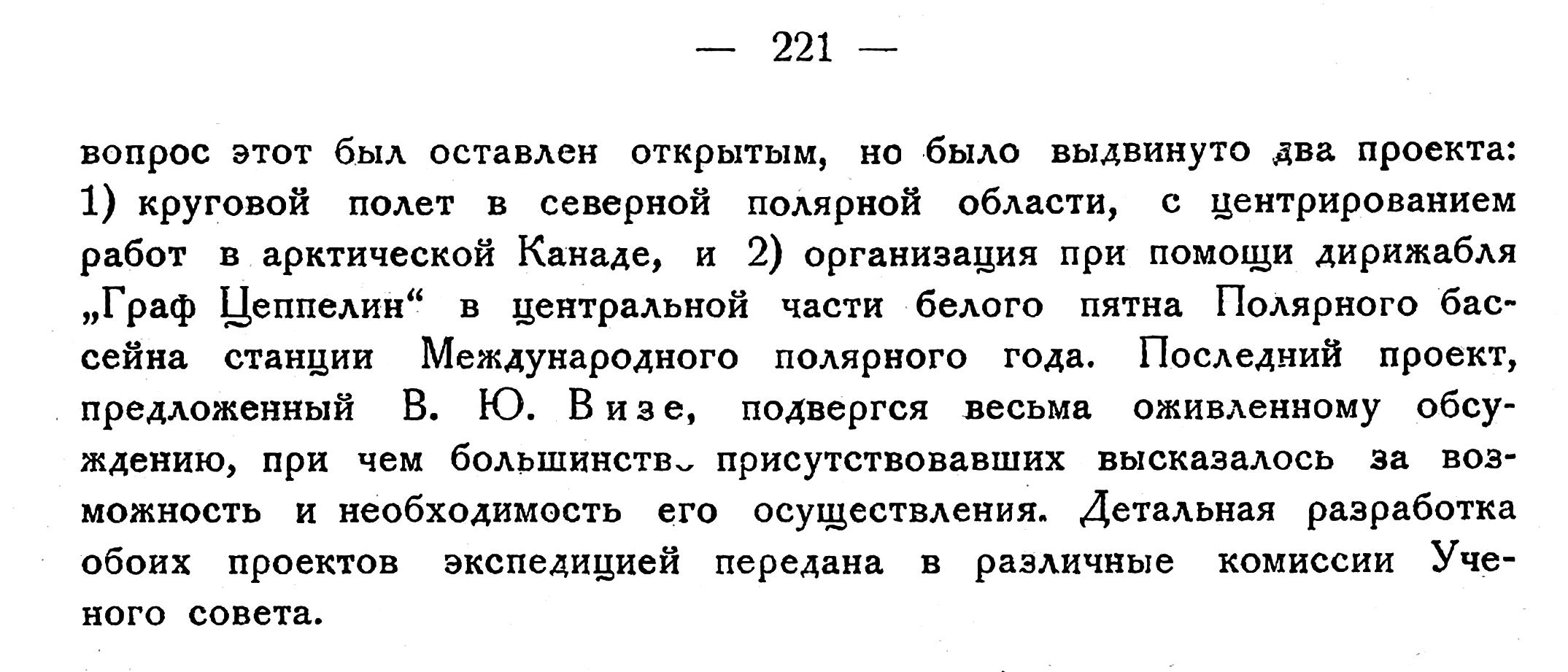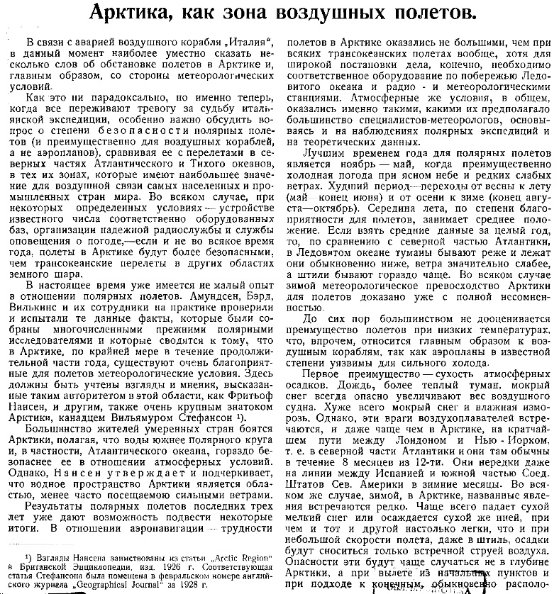 Также и Нансен, который всех больше вправе дать решающее заключение в этом вопросе, уже давно высказался в пользу воздушного корабля, как средства для полярных путешествий. Нансен писал проф. Hergessll’ю в 1909 году: „в чисто географическом отношении такие путешествия с воздушными кораблями дадут громадные результаты даже и при условии, если не будет произведено спусков на поверхность. Они укажут на распределение суши и моря довольно точно и позволят нам сделать важные заключения о топографии неизвестной еще полярной области, имеющие величайшее значение для вопроса о циркуляции гидро- и аэросферы. Работа Гелланд-Ганзена и моя о Норвежском море, которую Вы получили, Вам покажет какое большое значение я придаю этой проблеме. Мы сейчас гадаем лишь при помощи гипотез о том, что существует в неизвестных областях. Во время такой поездки возможно будет изучать распределение и состав ледяной поверхности в Полярном море, что также имеет большое значение для проблемы циркуляций моря. В случае же, если воздушному кораблю явится возможным опускаться в разных местах на лед и задерживаться на несколько часов на одном месте, могут быть произведены весьма ценные океанографические наблюдения: промеры, сбор проб морокой воды и наблюдения температуры на различных глубинах. Ко всему этому будут получены еще и очень ценные исследования над полярною атмосферою в различных слоях"