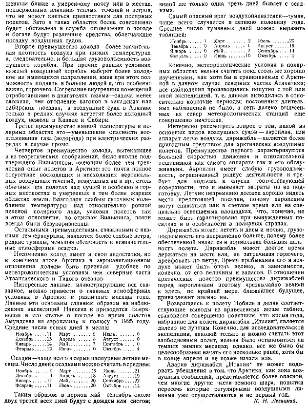 Погода.На первый взгляд обыкновенно кажется, что главными препятствием воздушным сообщениям через арктику должны явиться низкие температуры воздуха. Однако, согласно новейшим наблюдениям, весьма низкие температуры встречаются, как правило, лишь около самой поверхности. В слоях же, какие входят в расчет при предполагаемых полетах (1000 метр.), следует ожидать температур лишь немного более низких, нежели те, в каких обыкновенно протекают воздушные полеты в умеренных широтах. Поэтому, в этом отношении ни к воздушному кораблю, ни к людям не будет предъявляться никаких особых требований. Более серьезен вопрос: не будут ли экспедиционному кораблю угрожать бури, осадки, облачность и туманы, а также какое время года следует считать наиболее благоприятным для предприятия.